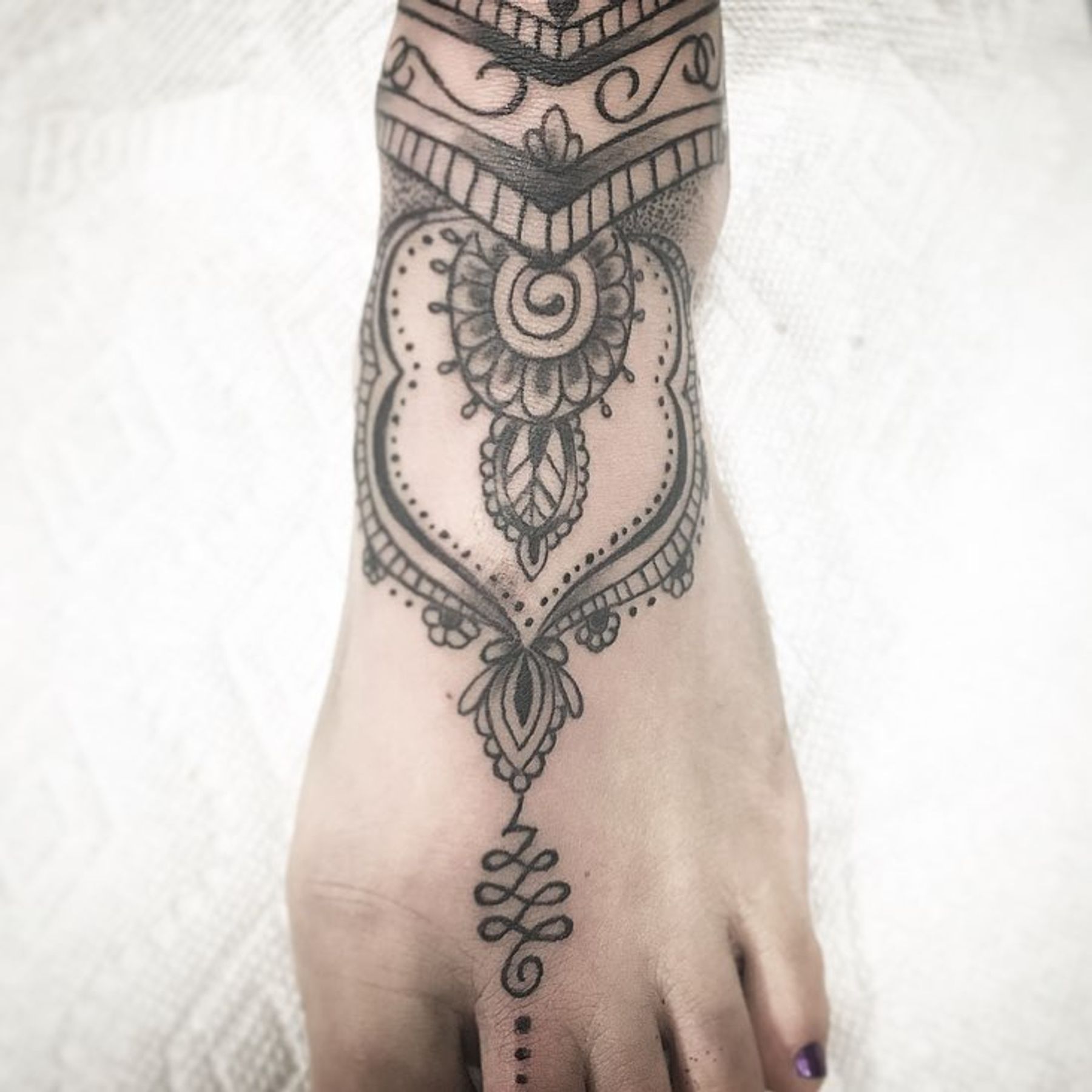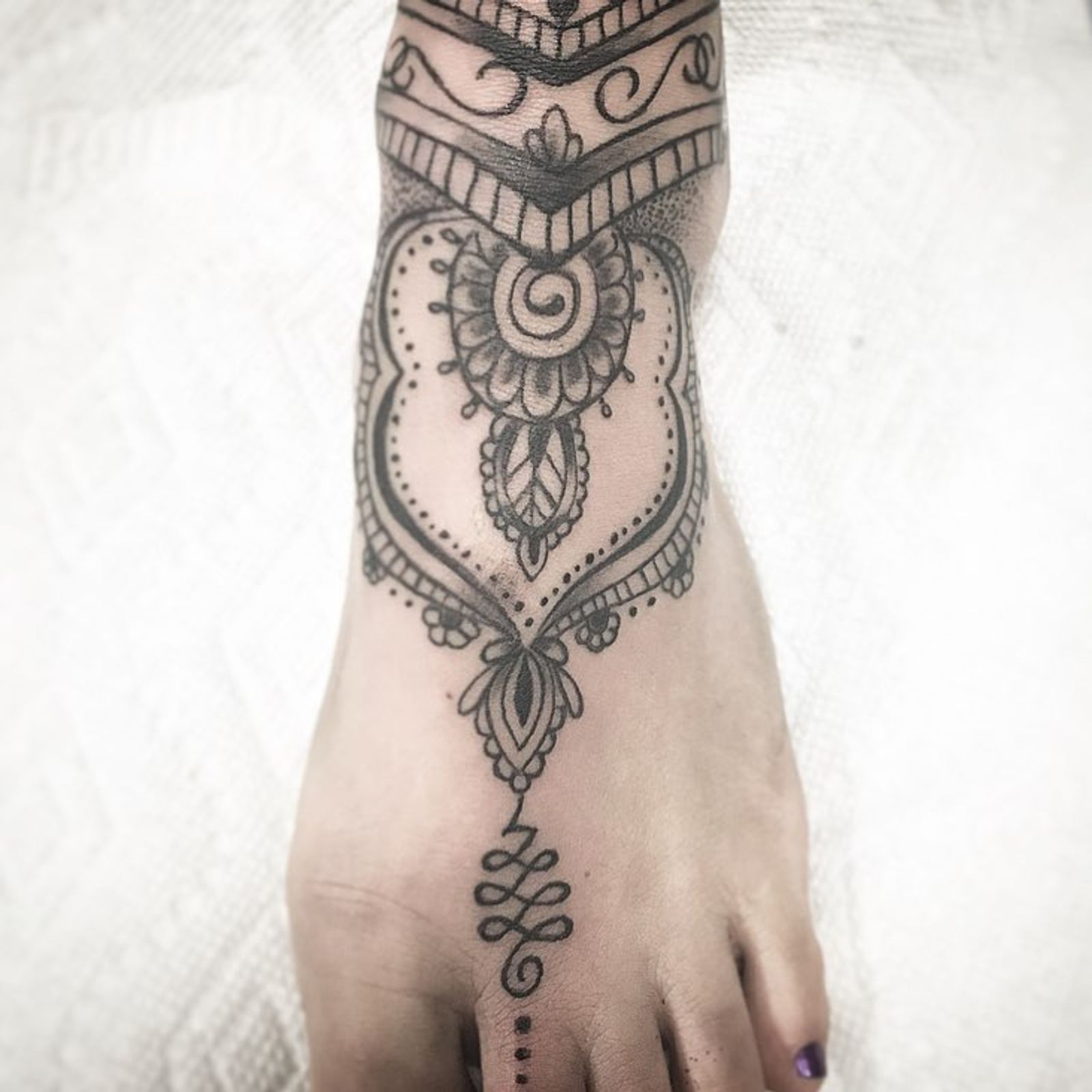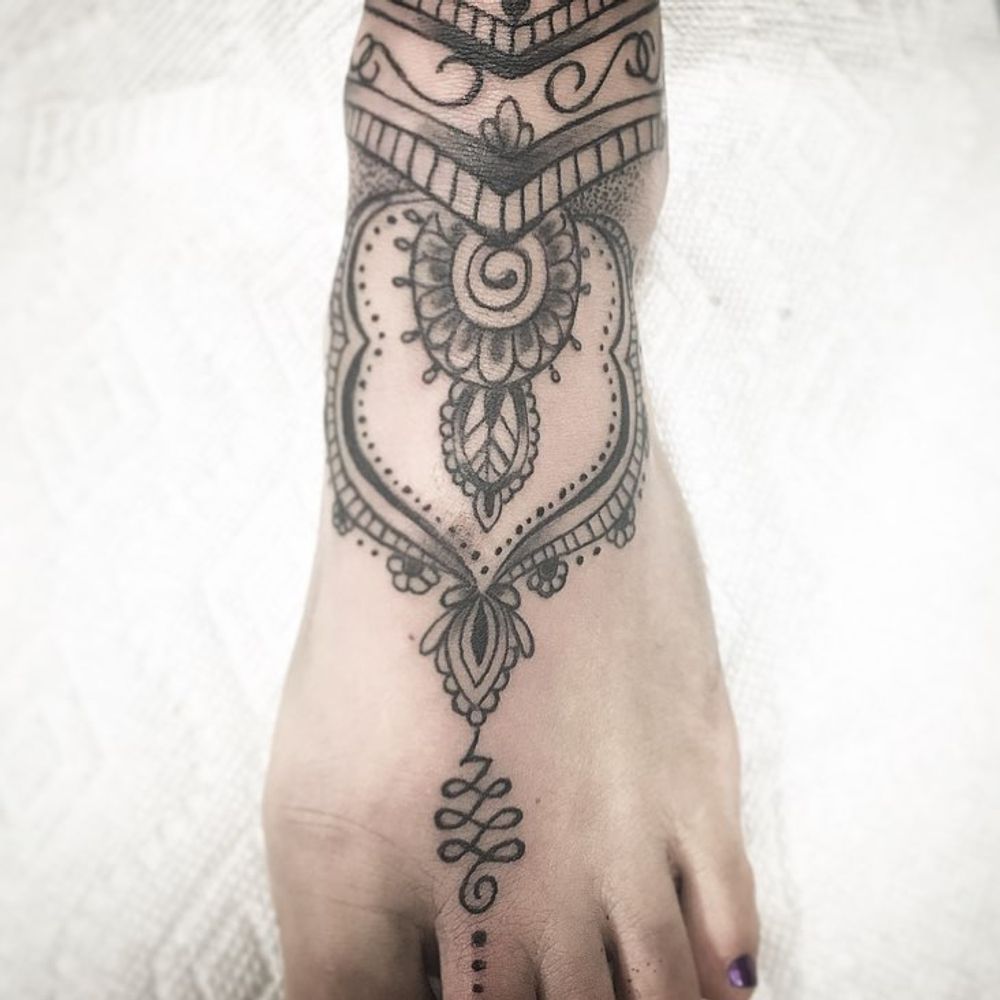 Fun little mehndi design on Angie, by Kristen Goetz #mehndi #foot #mehndidesign #linework #visionarytattoo #kristengoetz
