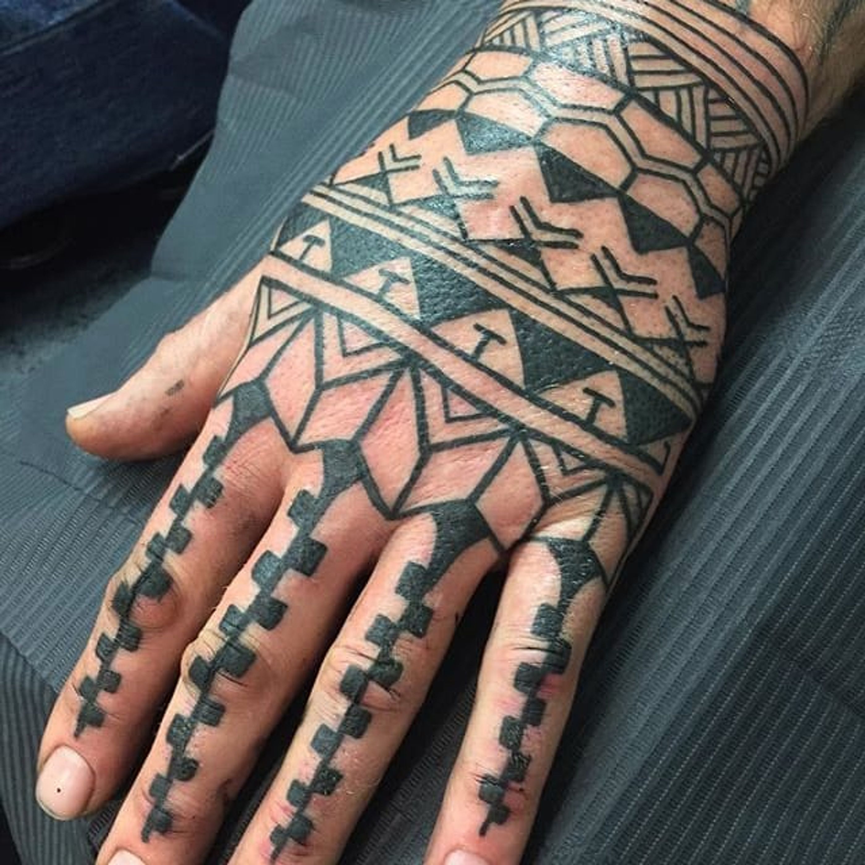 Some Maori patterning on one of Chris Higgins' clients' hands (IG—higginsandco). #blackwork #ChrisHiggins #Maori #tribal