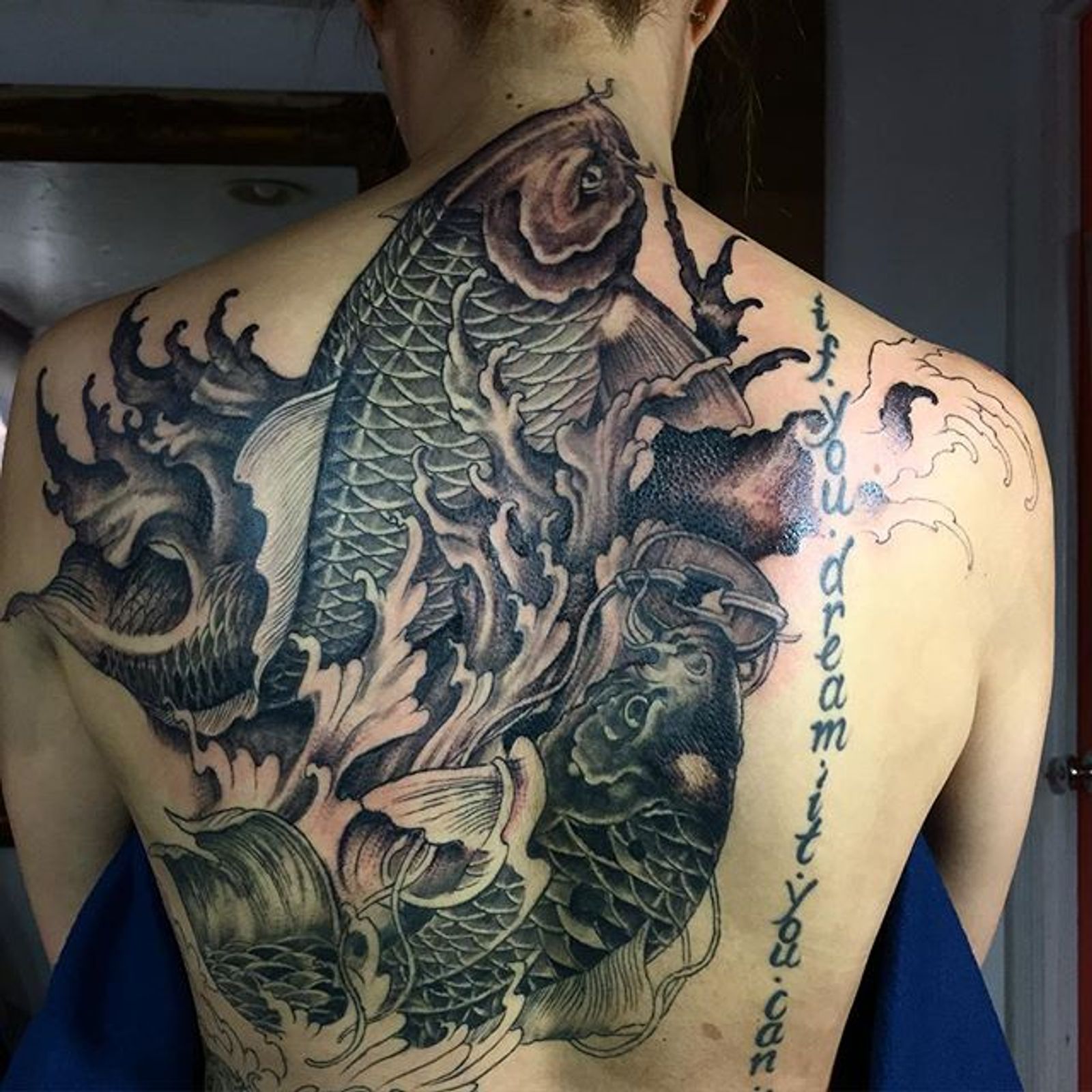 Her back piece is still in progress. #blackfishtattoo #blackfishtattoonyc #blackandgreytattoo #backtattoo #back #blackandgrey #nyctattoo #koifishtattoo #koi #koifish #japanesestyletattoo #japanesetattoo #japanese #japanesestyle