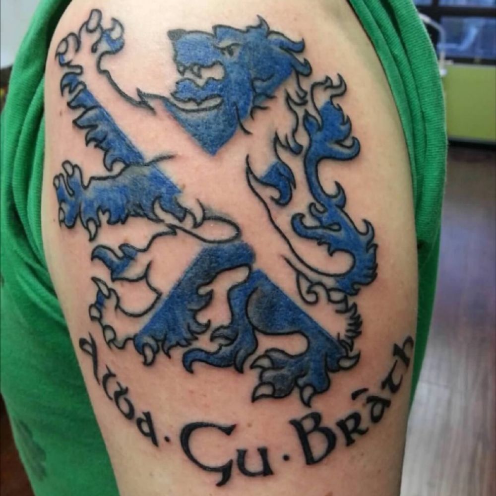 Left shoulder; combination of both Scottish flags, representing my ancestry