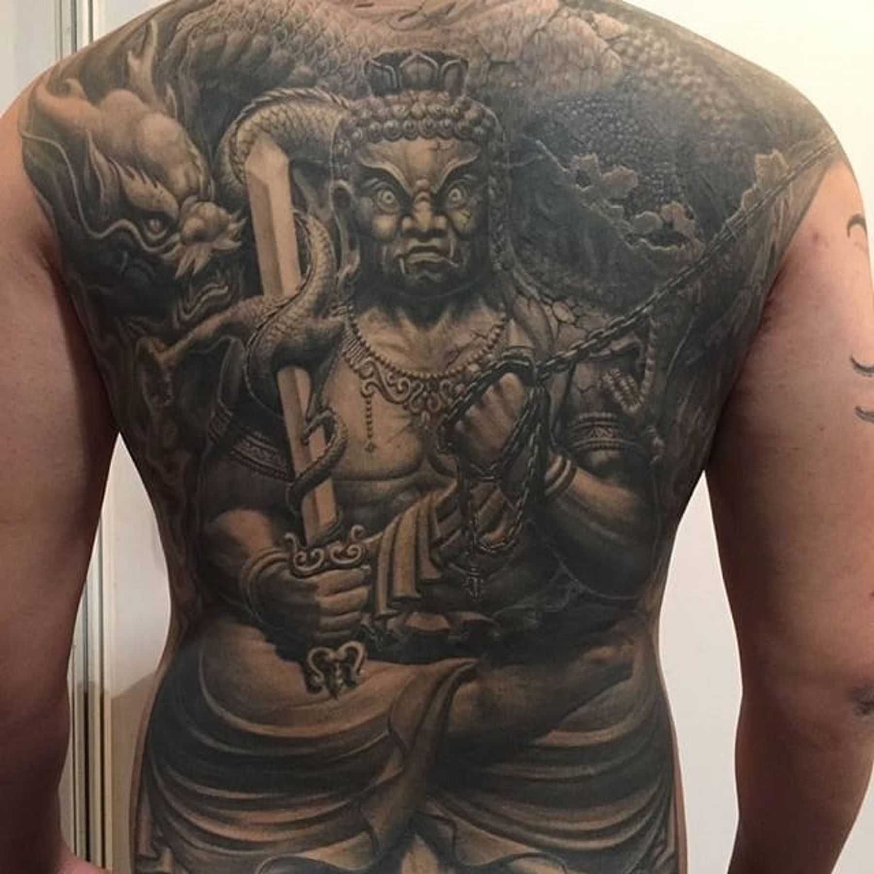 A fierce Fudo Myoo with a dragon by Heng Yue (IG—newassasin_tattoo). #blackandgrey #dragon #FudoMyoo #HengYue #Japanese #largescale #realism