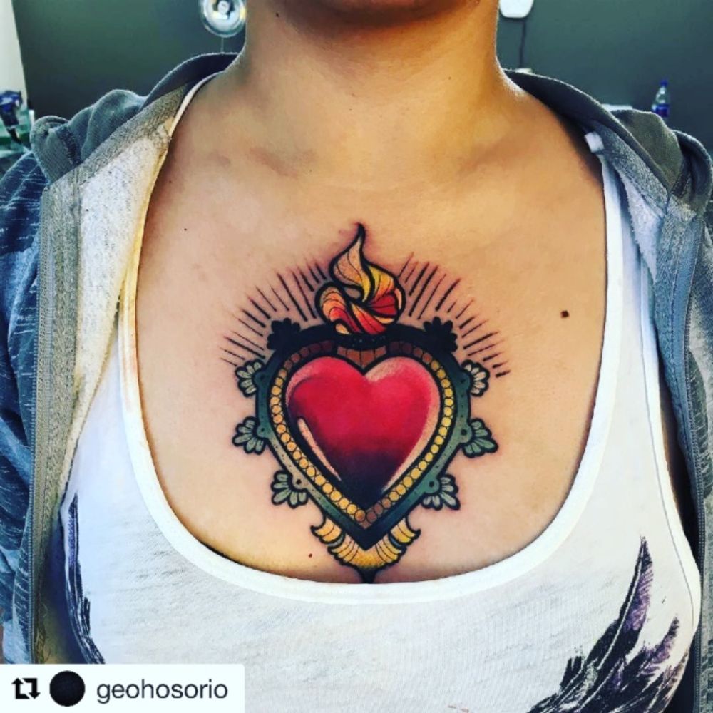 Artist: Geo Hosorio Piece: Sagrado Corazón (original) Estudio 184 Tattoo & Piercing #sagradocorazón #sacredheart #mexicocity #cdmx #chesttattoo