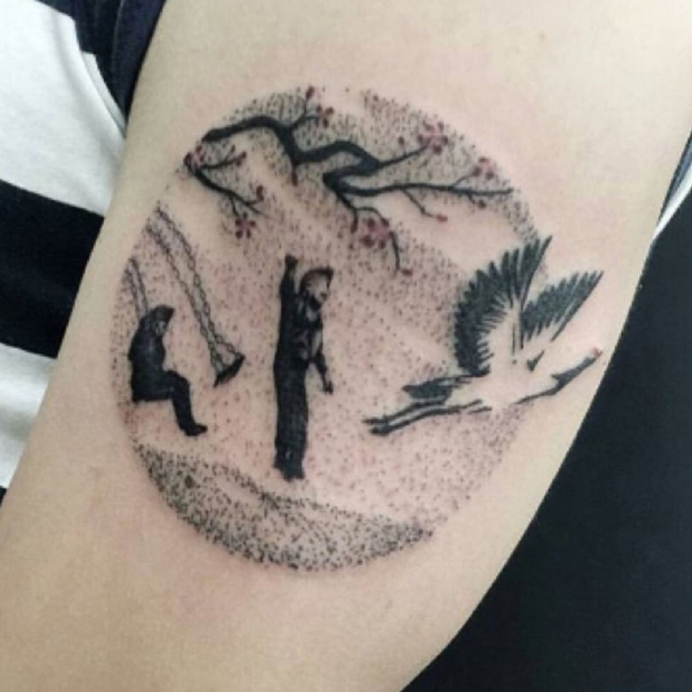 #tomtattooer from #victimsofink #melbourne #customtattoo #dotwork style #tattoo #tommyrattle #blackink #victimsofinkchapelst - #girl & #boy on #swing #stork