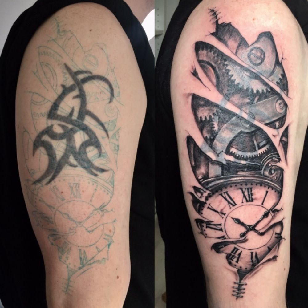 Cover #covertattoo #clocktattoo #rippedskin #blackandgrey
