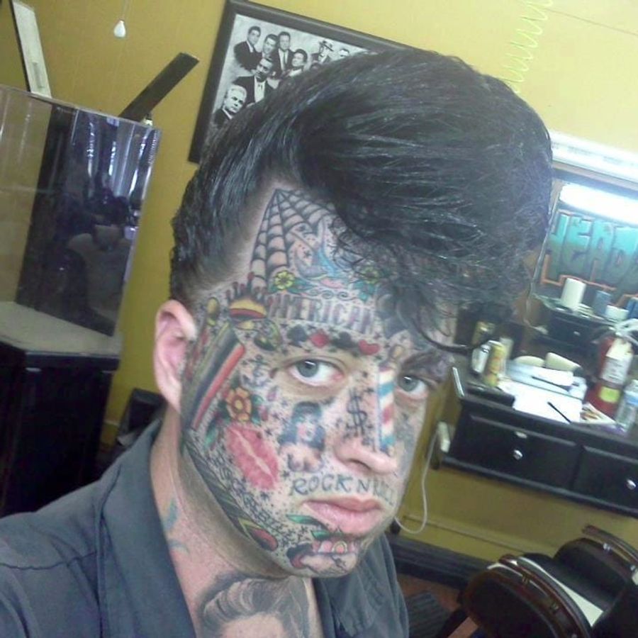 Thankfully, one occupation is always open to those who tattoo a myriad of dumb shit on their face--racist barber! #facetattoo #barberpoll #rocknroll