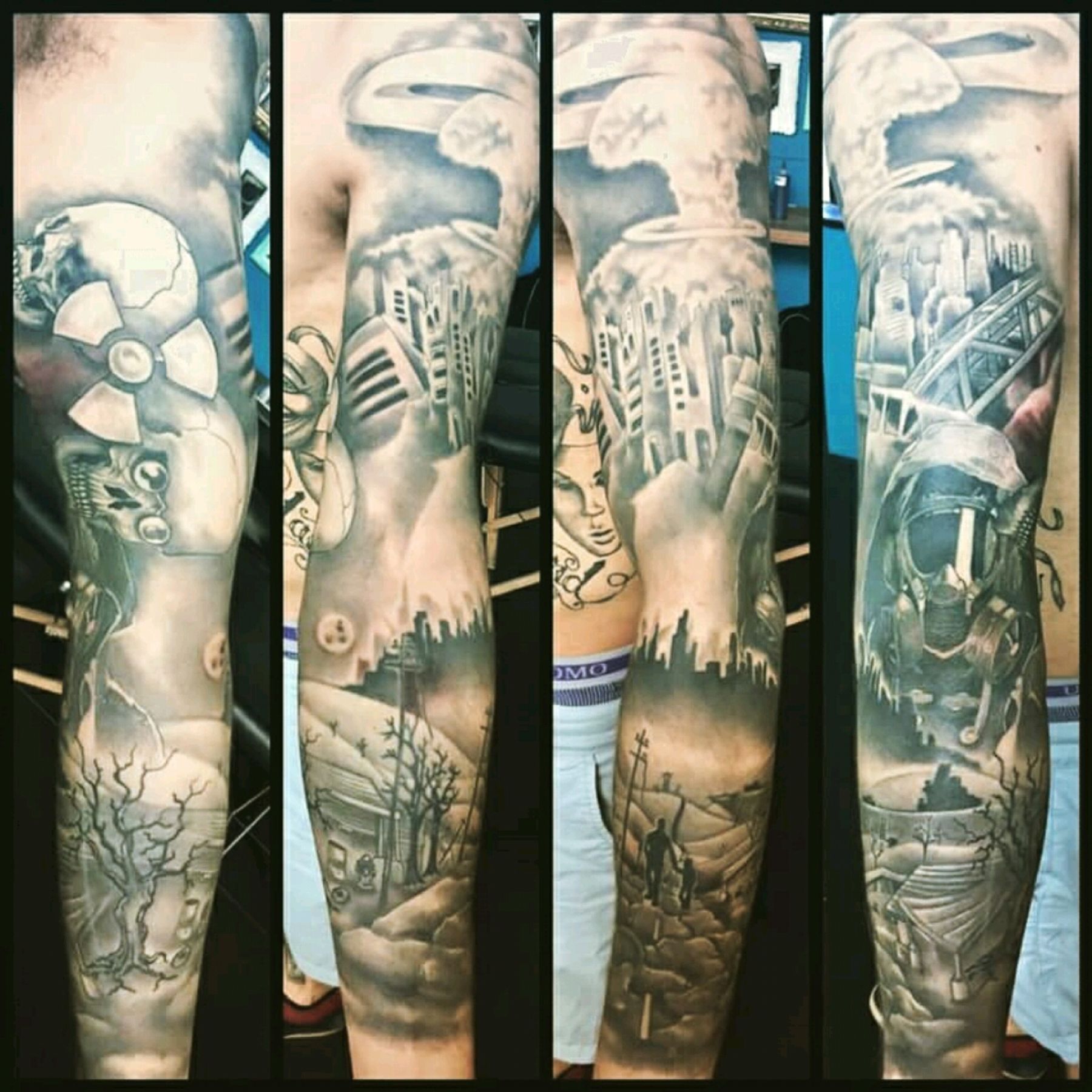 Post-nuclear world sleeve #postapocalyptic #nuclear #nucleartattoo #radioactive #dystopia #blackandgrey #blackandgreytattoo #gasmask #skulls #glasgowink #glasgowtattoo #tattooglasgow #polishartist #scotland #scotlandtattoo #polishtattoo