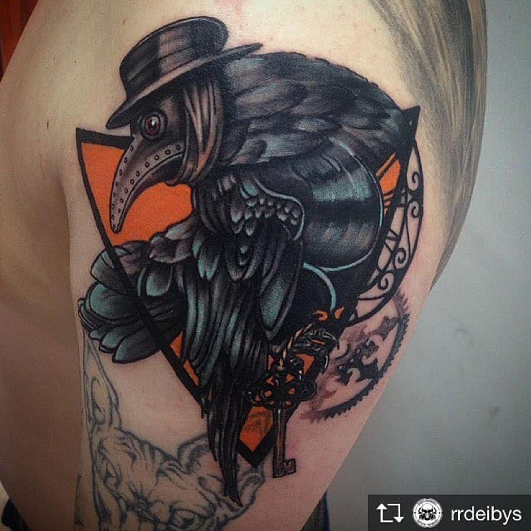 Steampunk raven by Deibys Rodriguez (via IG -- inknovationtattoocompany) #deibysrodriguez #plaguedoctor #steampunk