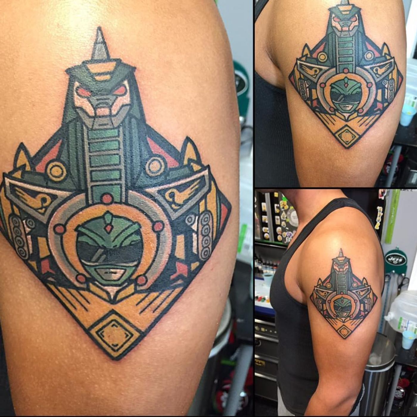 An awesome traditional take on the Green Ranger and the Dragonzord via J. Calenzo (IG—jcalenzotattoo). #Dragonzord #GreenRanger #MMPR #PowerRangers #traditional