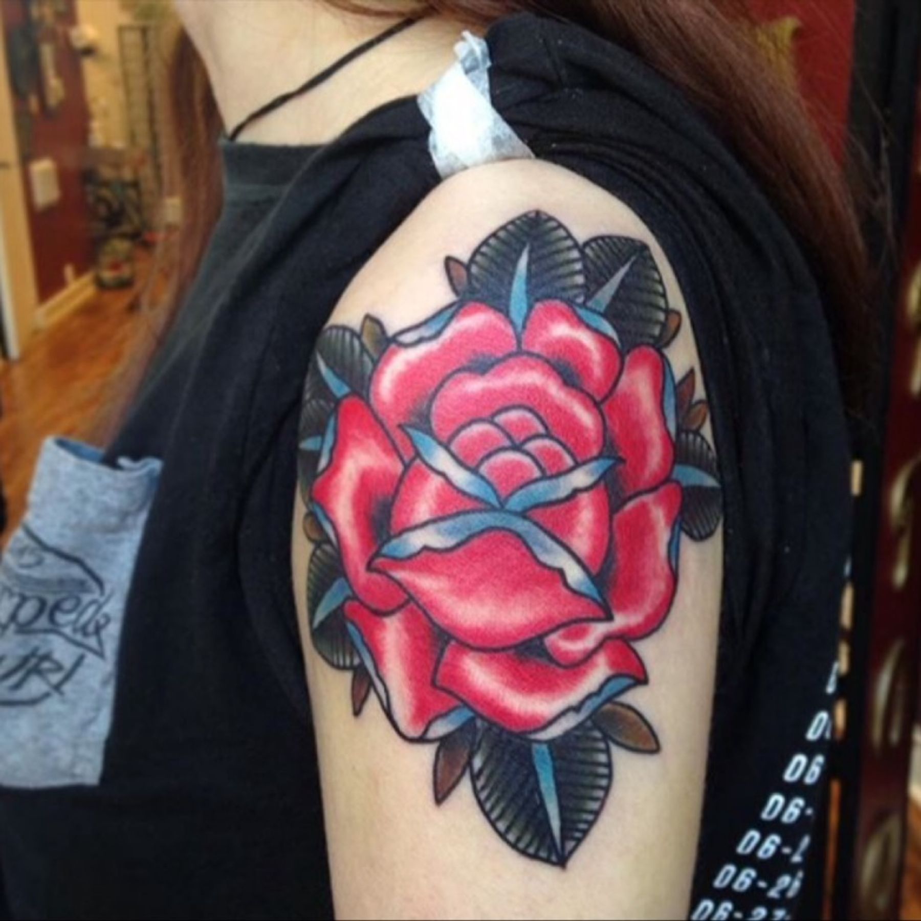 Traditional rose done by Kim Marks at Carne Tattoo in Victoria, BC. The starting piece for my traditional sleeve. #traditional #rose #traditionalsleeve