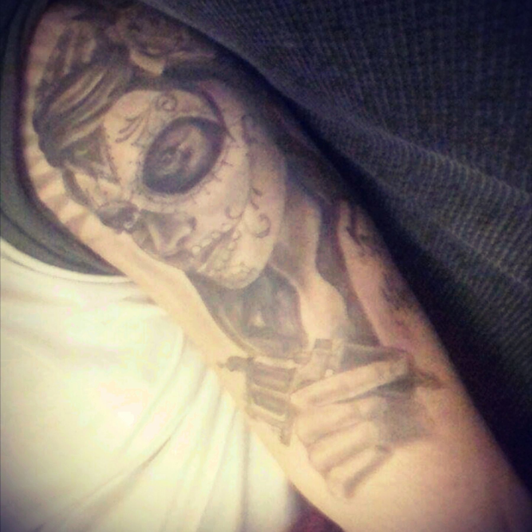 This is my tattoo of santa muerte done by John selly at glow tattoo studio in mid wales, this is it fully healed but in terrible lighting