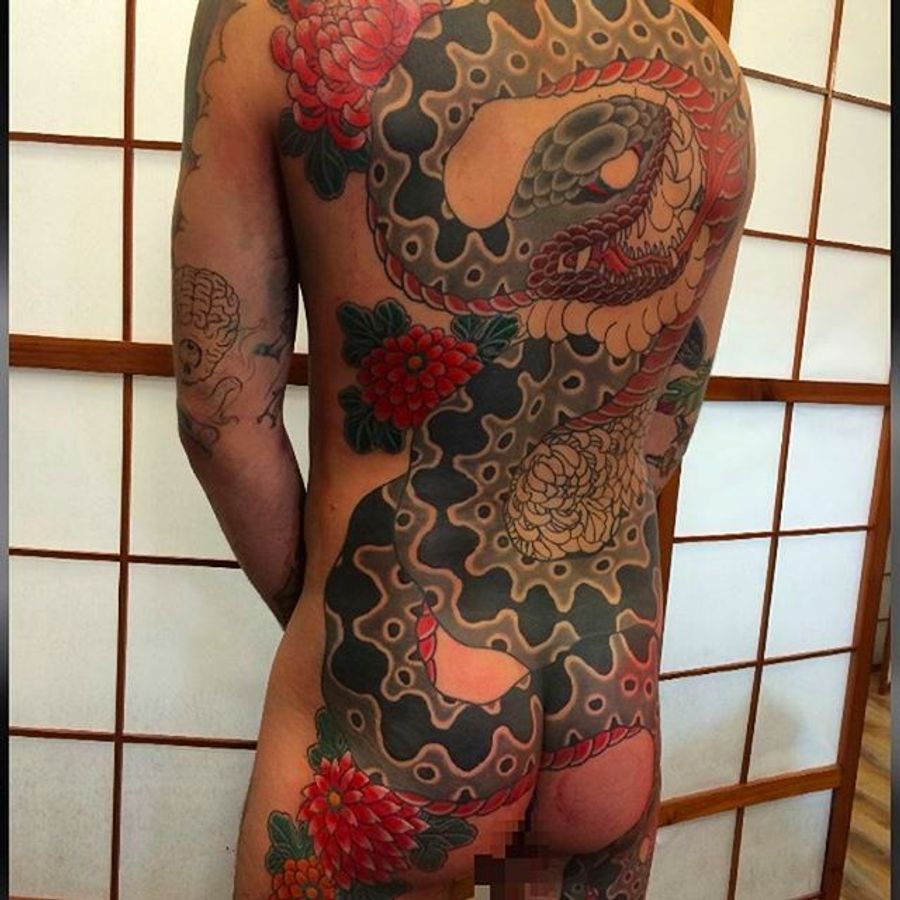 An awesome Japanese style back piece tattoo of a HEBI/Snake. #davidramirez #japanesetattoo #hebi #snake #japanese #Japanesestyle