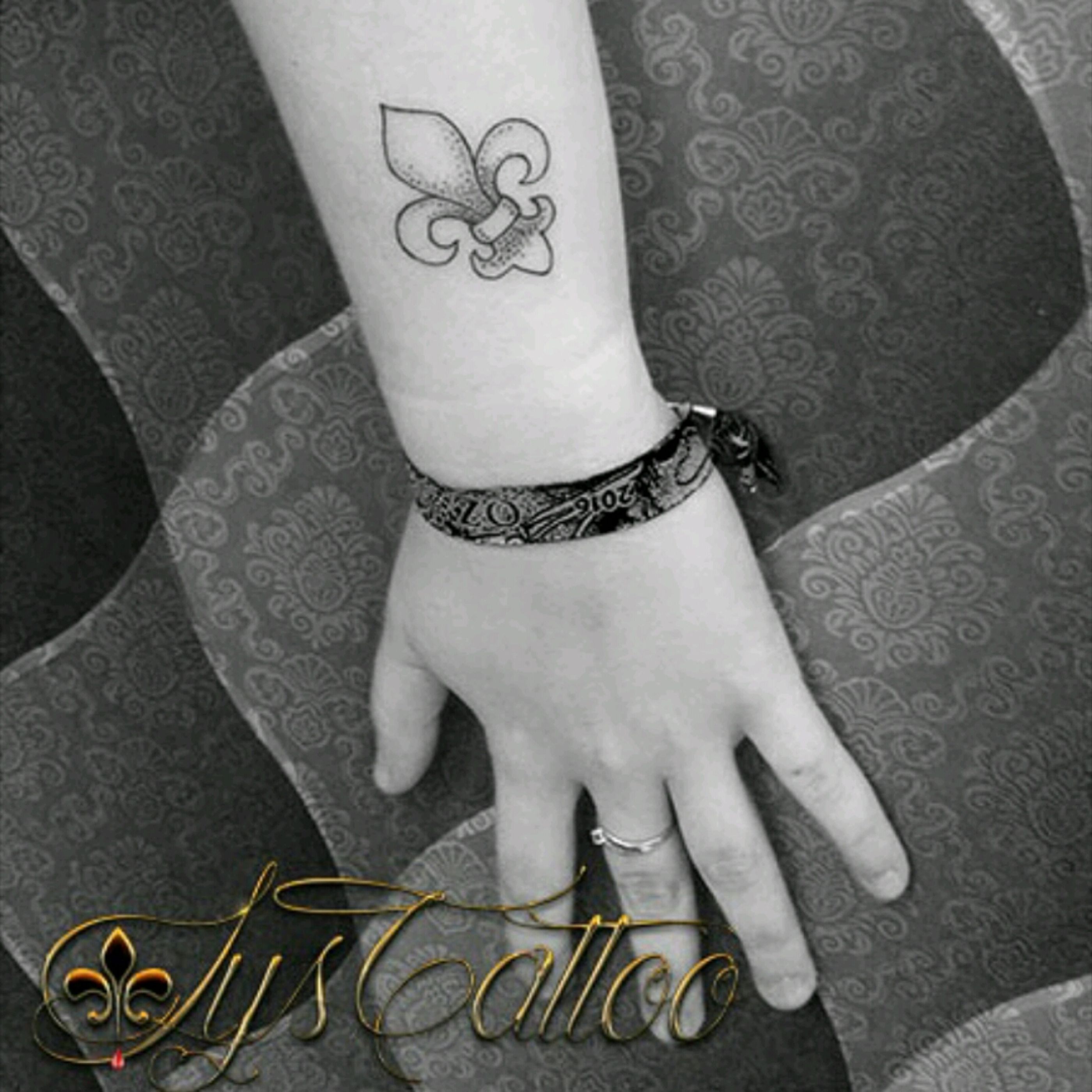 Tatouage poignet femme symbole fleur de lys lignes et dotwork by lys tattoo à Gradignan proche Bordeaux Gironde