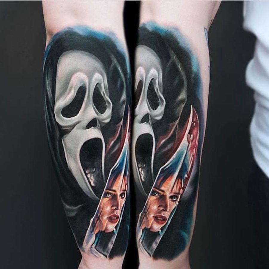 A portrait of Ghostface with Sid's reflection in his knife by Jordan Croke (IG—jordancroketattoo). #color #Ghostface #JordanCroke #portraiture #Scream