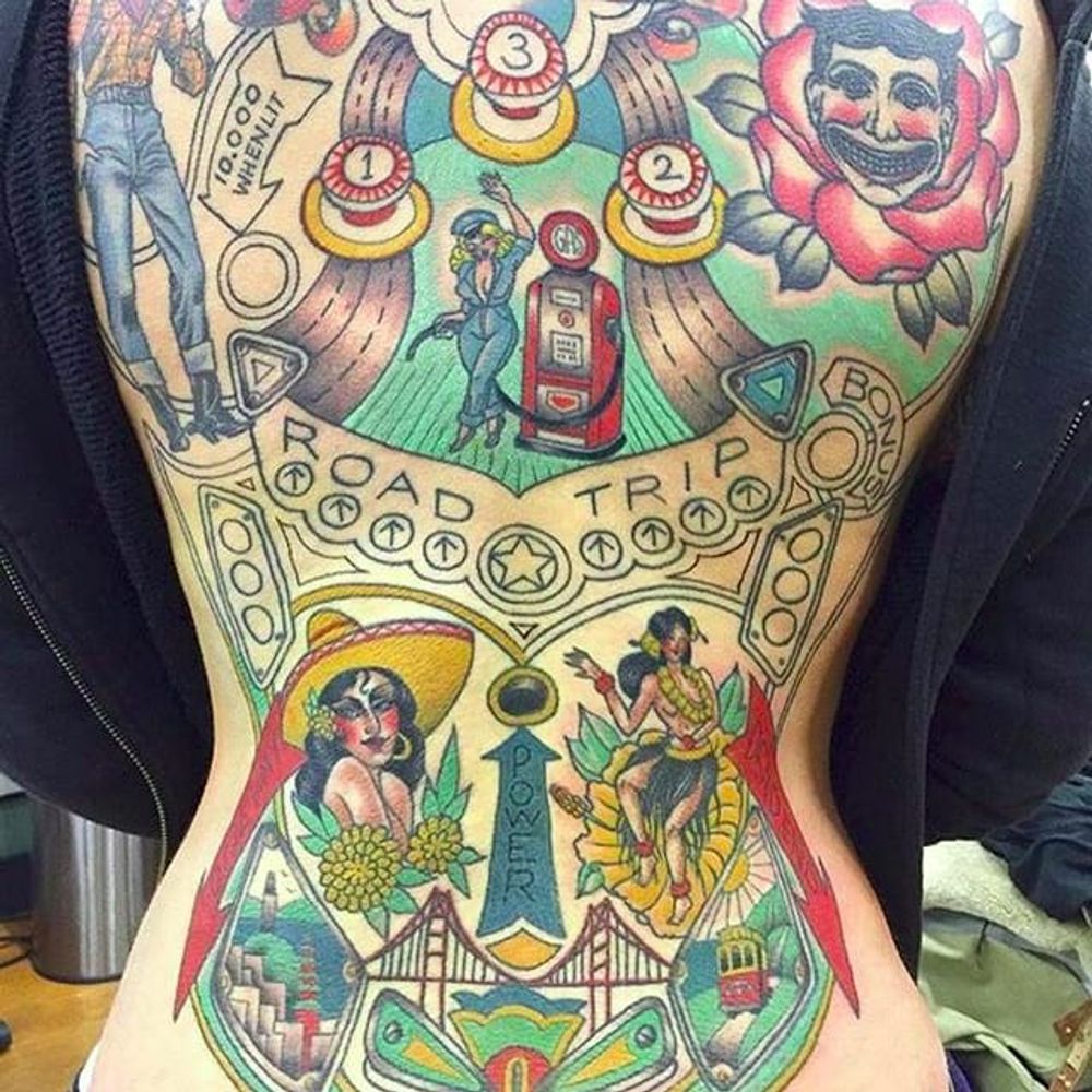 Back piece by Annabelle Zakaluk (via IG -- pinballink) #pinball #pinballtattoo #AnnabelleZakaluk