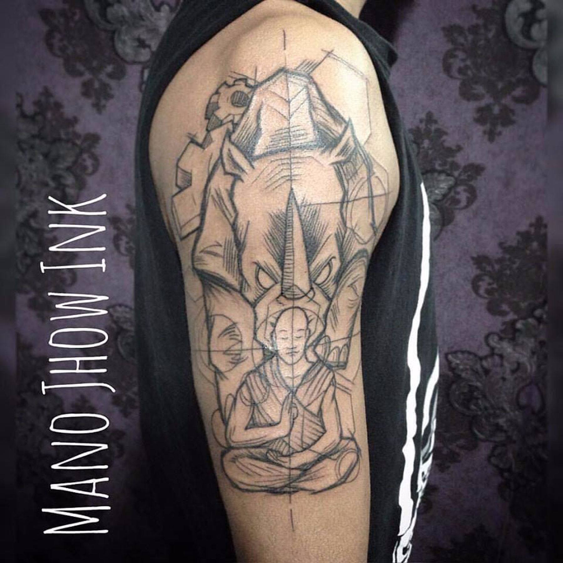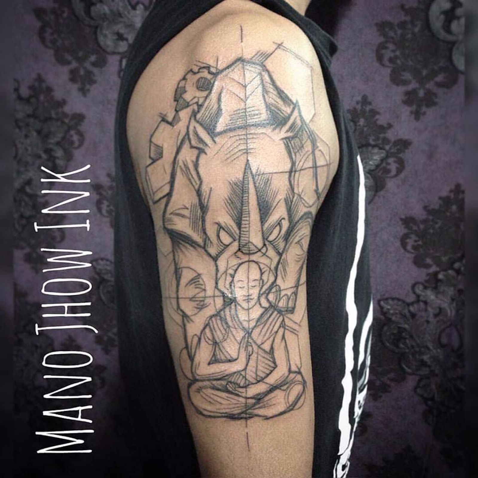 Calmaria por fora, mas por dentro.... #ViniciusLeite #ManoJhowInk #tatuadoresdobrasil #brazilianartist #brasil #brazil #monge #monk #rinoceronte #rhinoceros #meditação #meditation #engrenagens #gears #sketchstyle