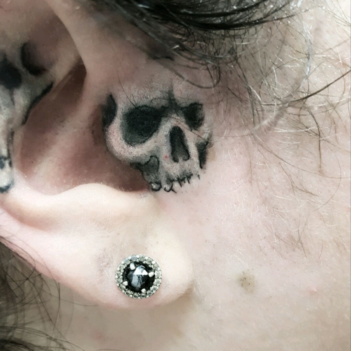 Skull in ear #adventuretattoos #adventuretattoo #inkedadventure #www.adventuretattoos.com #SeanMilnes #beautiful #skulltattoo #skull #skullineartattoo #eartattoo #eartattoos