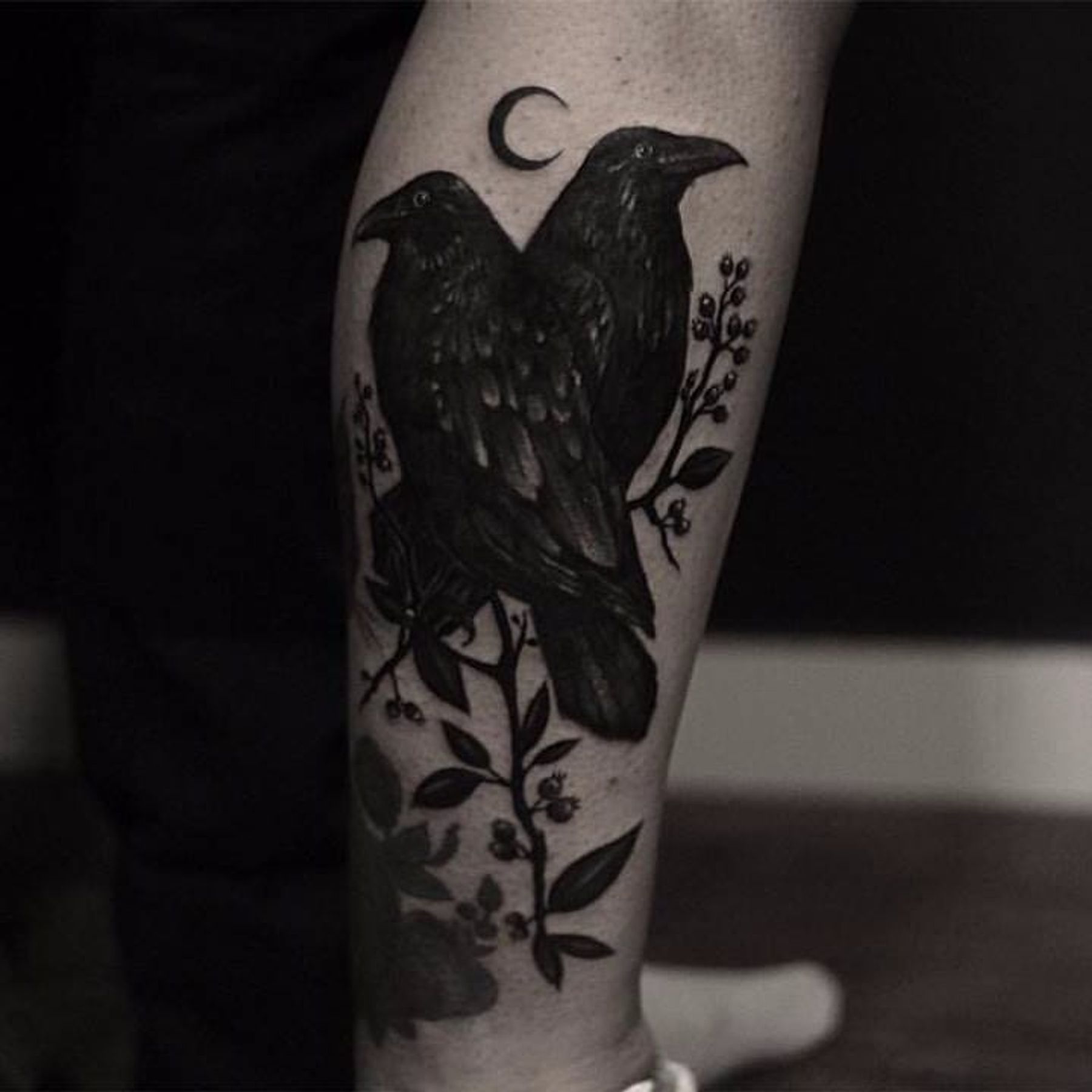 Corvos com uma pequena lua feito por Liz Minelli #LizMinelli #corvo #blackwork #crow #TatuadorasDoBrasil