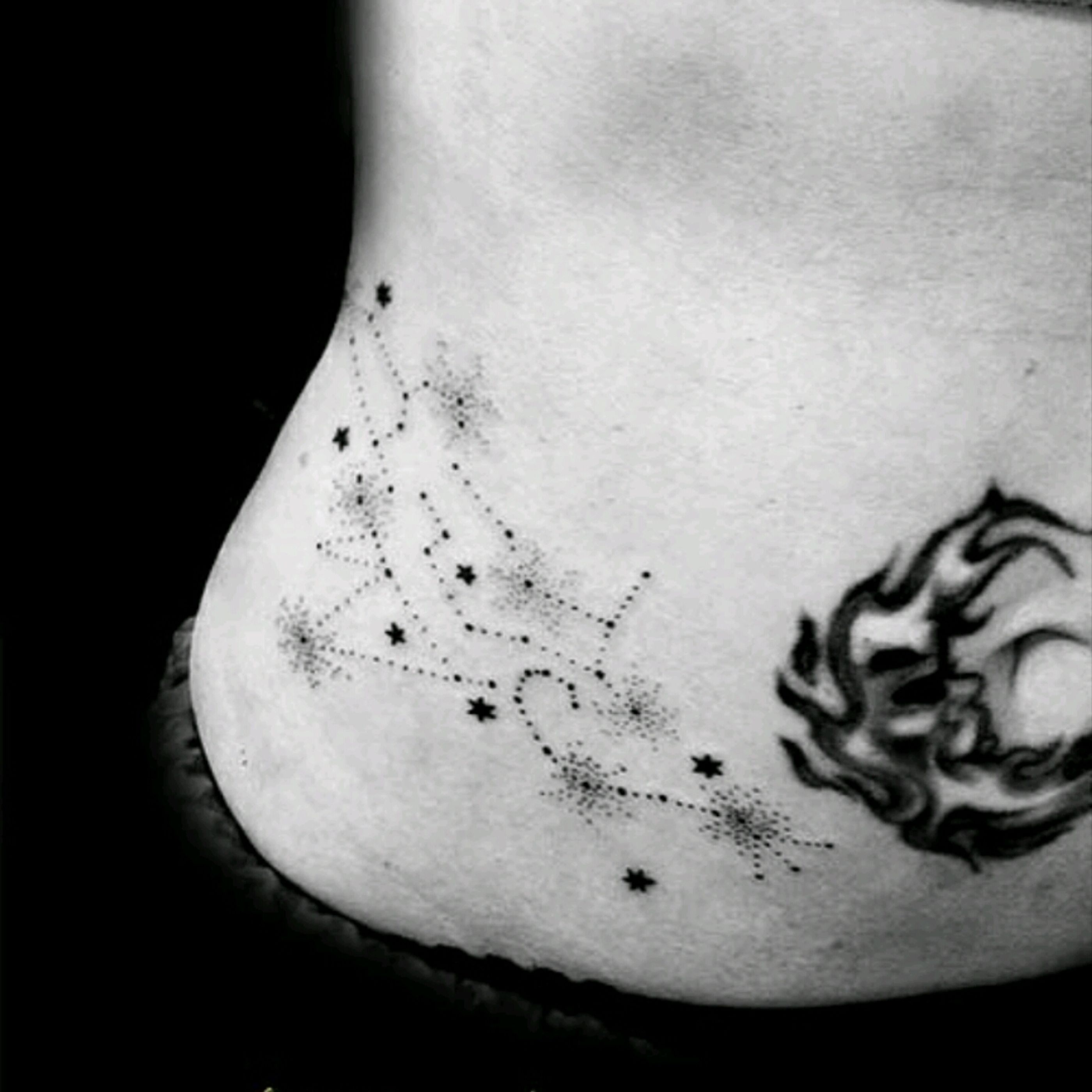Tatouage sur les hanches, côté du ventre, femme, constellations du lion, du scorpion, du capricorne et de la vierges en pointillé et dotwork , étoiles pleines, by lys tattoo votre tatoueur à Gradignan proche de Bordeaux et Bassin d'Arcachon en Gironde. Le tatouage central n a pas été réalisé par Lys tattoo