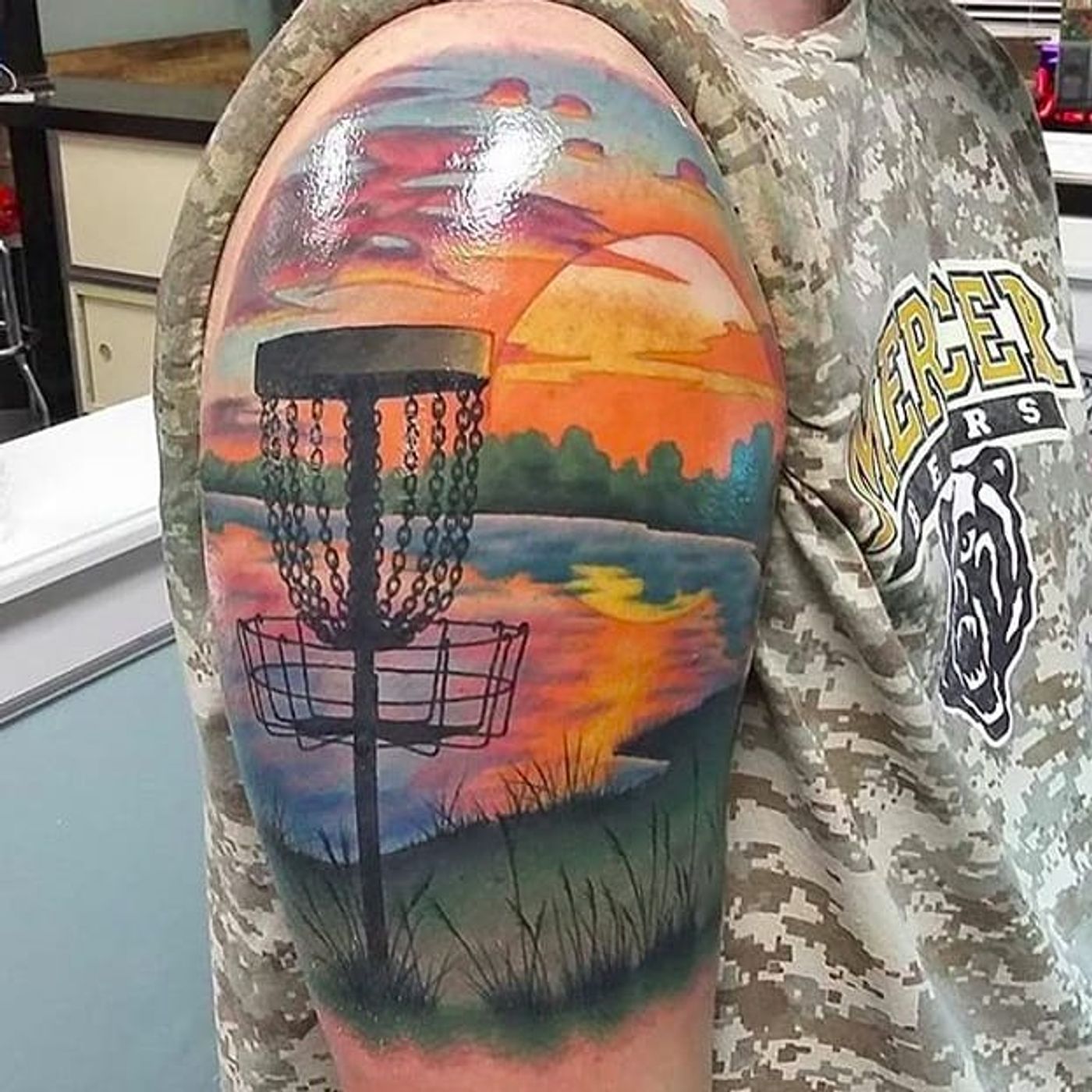 Sweet disc golf tattoo by Chris Libby (via IG -- canvasoffleshtattoos) #ChrisLibby #discgolf #frisbeegolf #frisbeegolftattoo #discgolftattoos