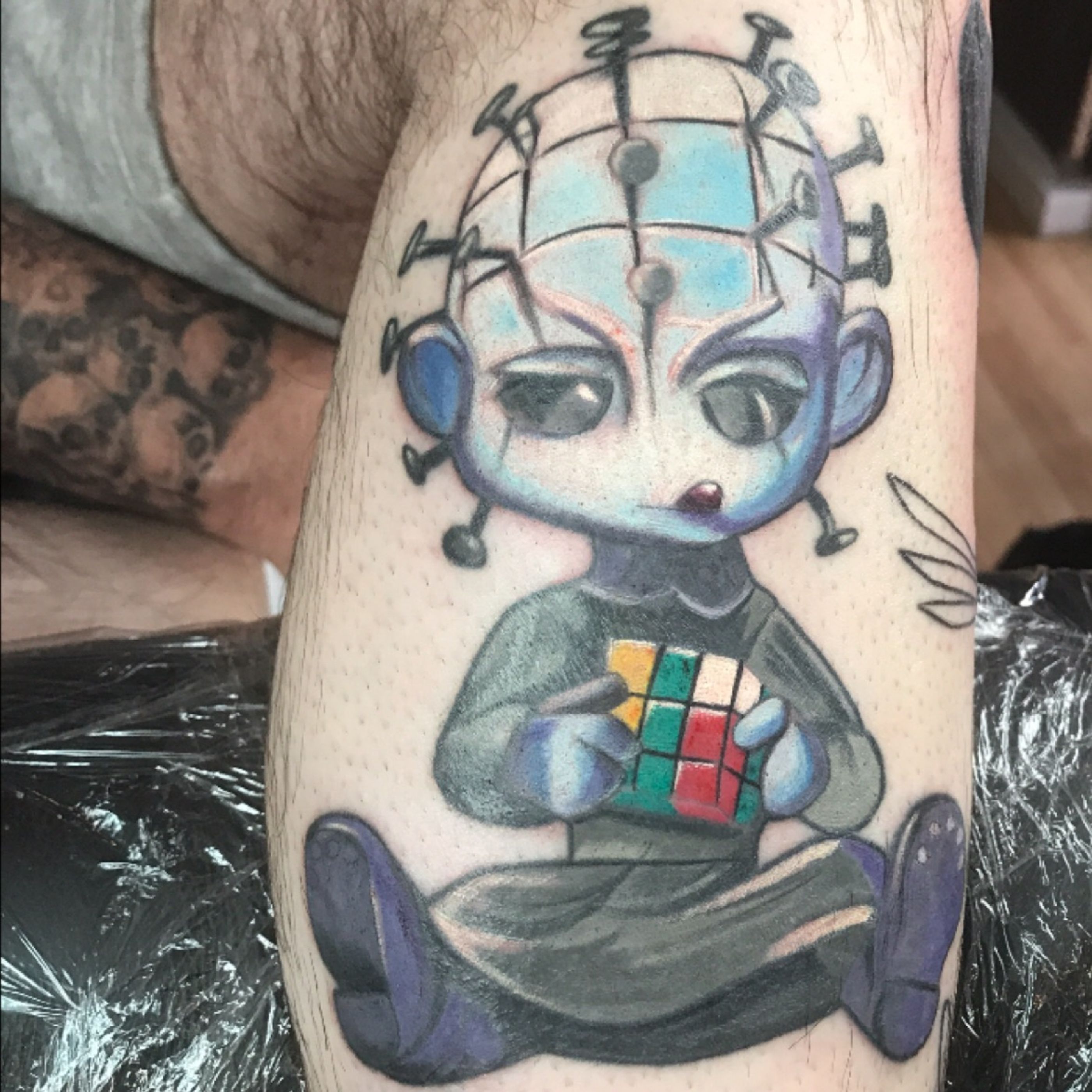 Full colour pinhead caricature as part of an on going full leg piece #pinhead #mrpinheadtattoo #pinheadtattoo #colour #colourtattoo