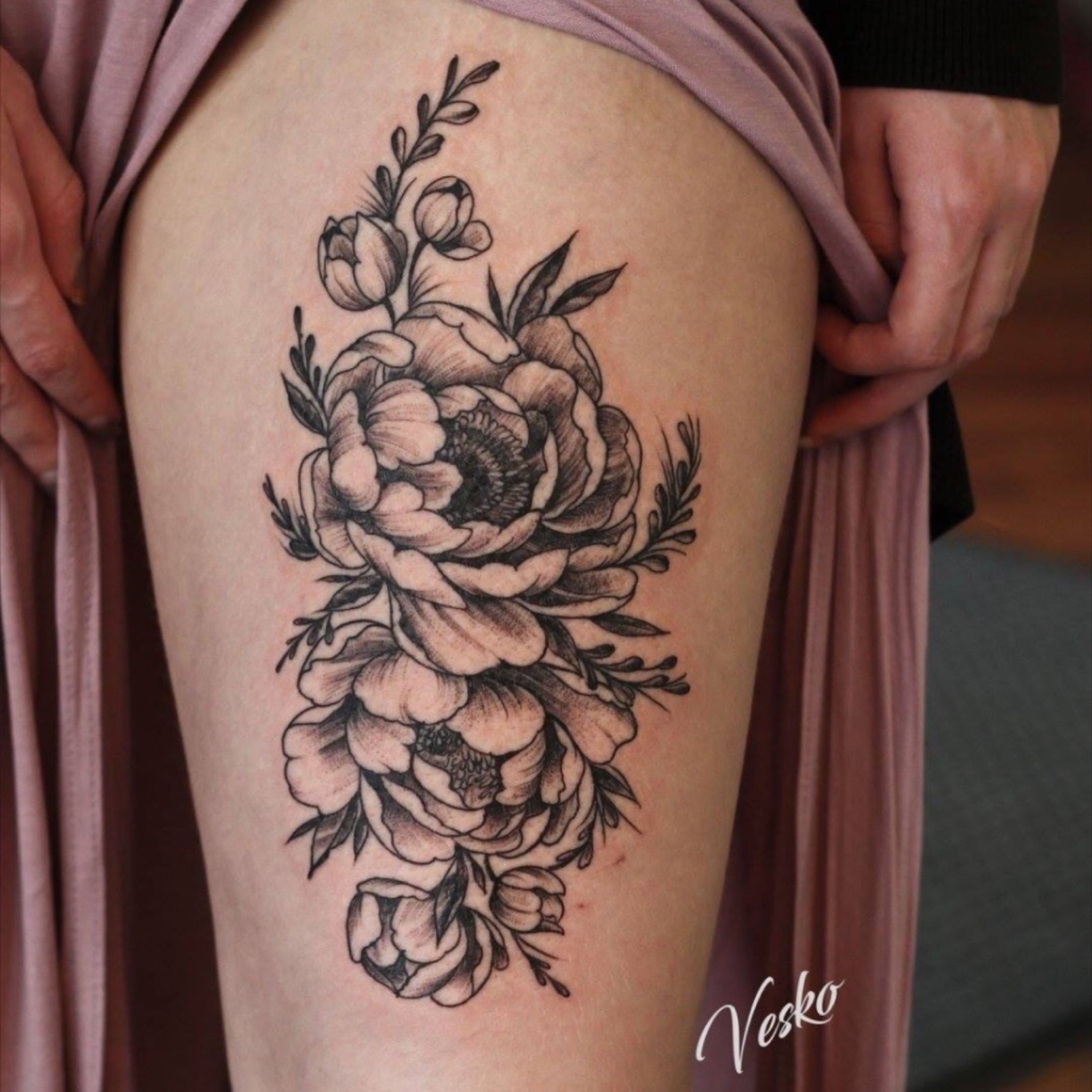 #botanical #flower #thigh #peony #firsttattoo #feminine