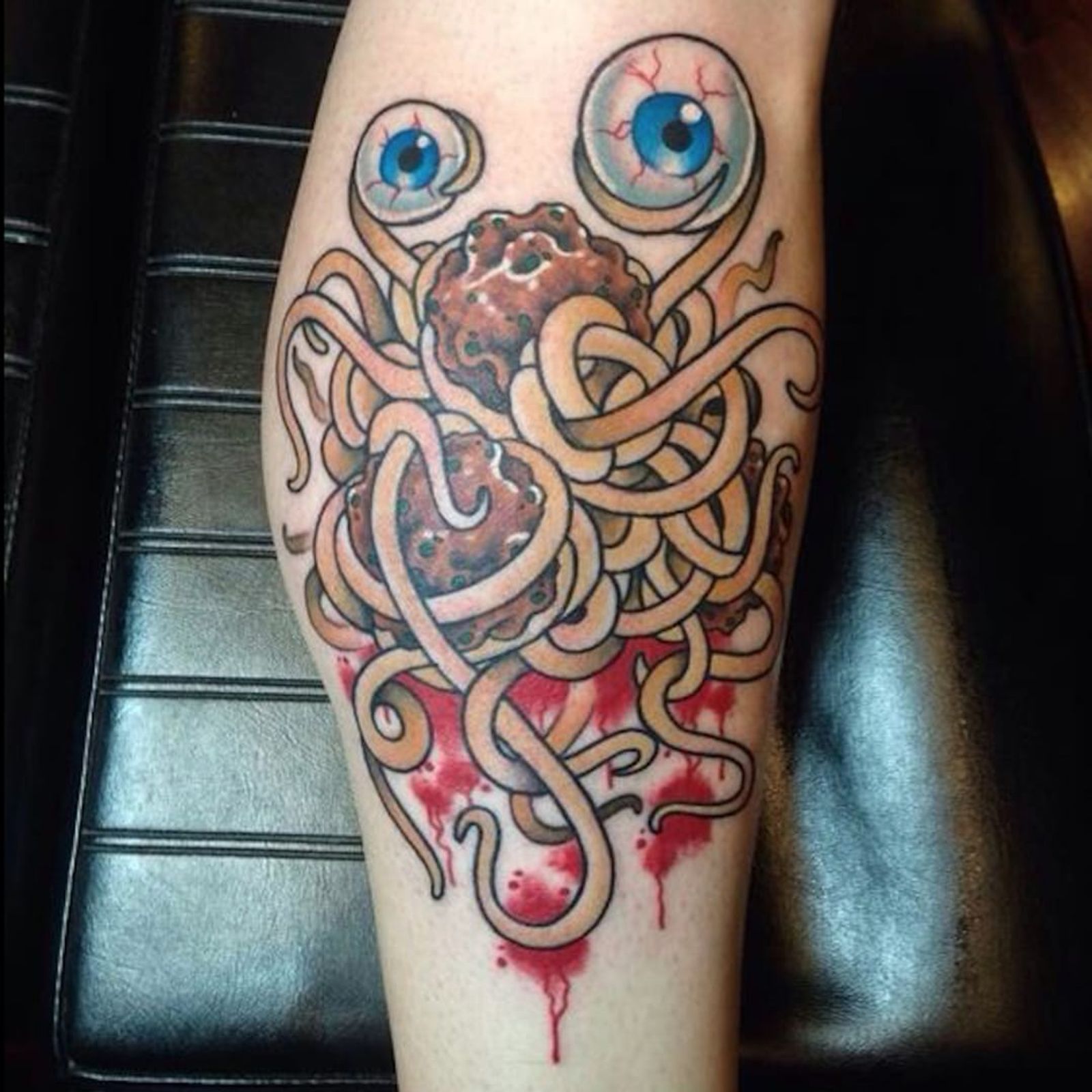 The Flying Spaghetti Monster by Al Garcia (IG—tattooalgarcia). #AlGarcia #TheFlyingSpaghettiMonster #traditional