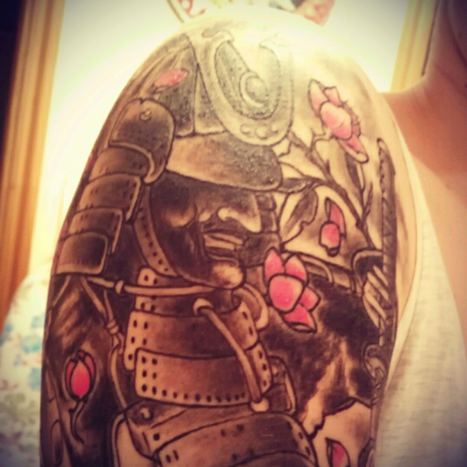 Japanese Samurai B&W with some pink peach flowers #japanese #samurai #black #white #b&w #arm #upperarm