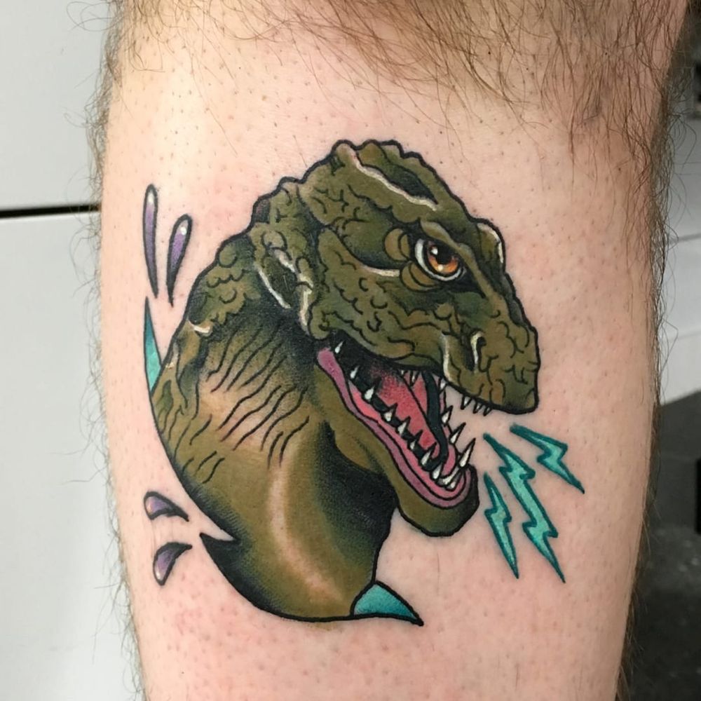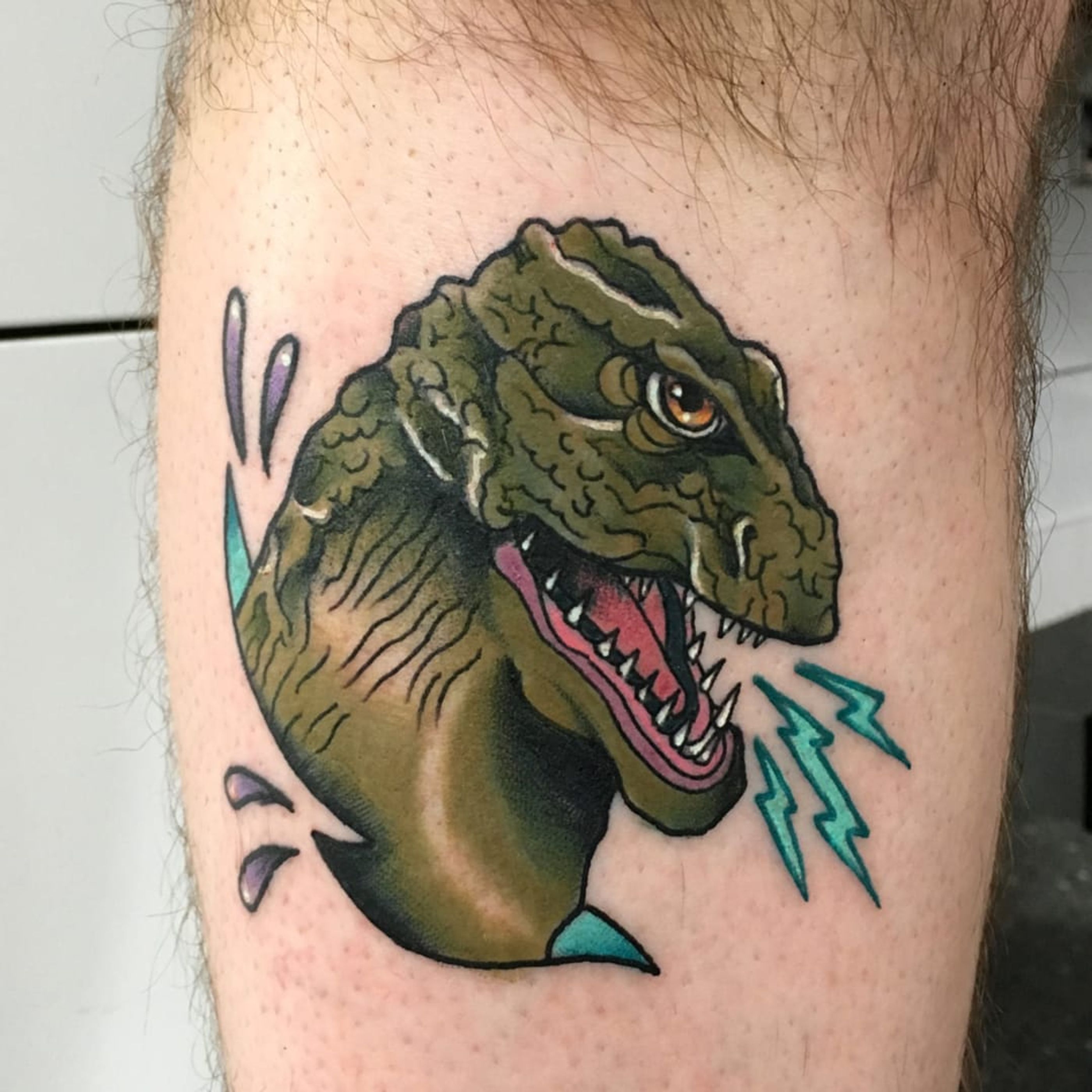 A neo-traditional Godzilla head by Natalie Morguette (IG—morguettetattoo). #Godzilla #NatalieMorguette #neotraditional