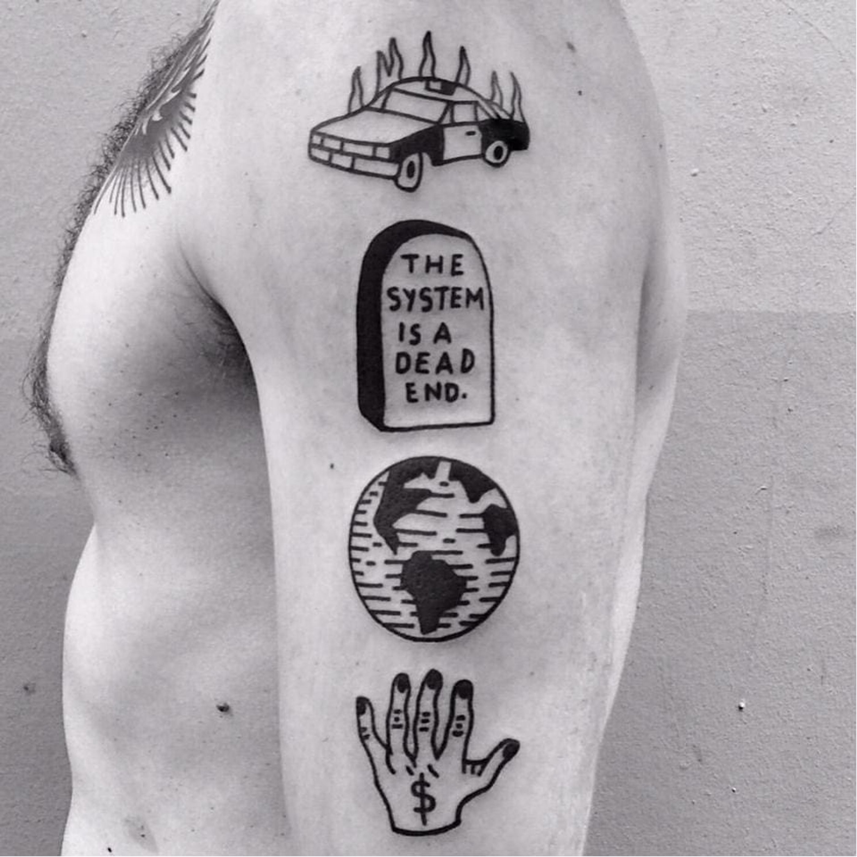 Anticapitalist tattoo by Eterno #Eterno #blackwork #anticapitalist #tombstone #earth