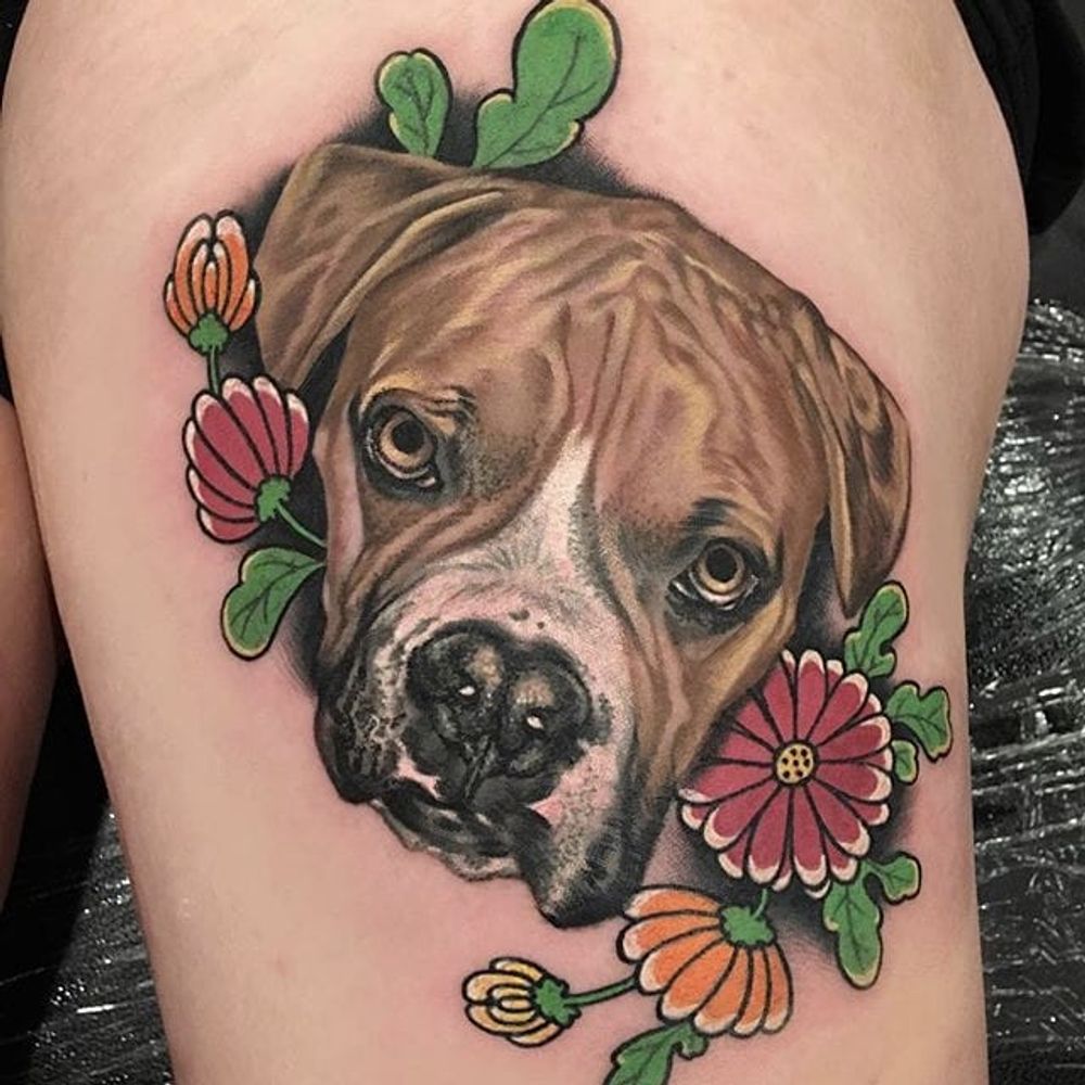 Puppy by Megan Massacre #MeganMassacre #puppy #dog #color #flower #realism #portrait #tattoooftheday
