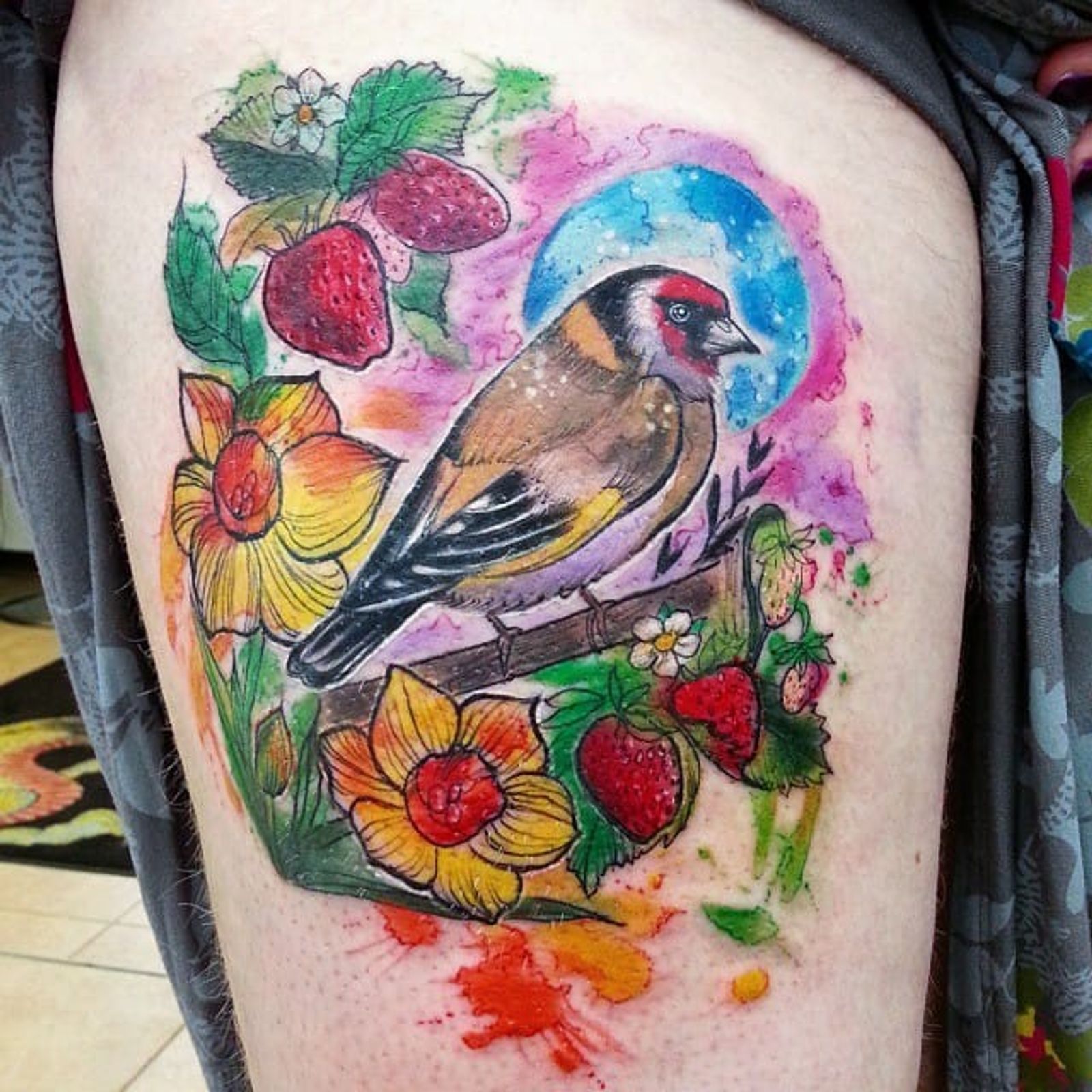 Beautiful goldfinch by Joanne Baker (via IG -- milky_tattoodles) #JoanneBaker #bird #birdtattoo #goldfinch #goldfinchtattoo