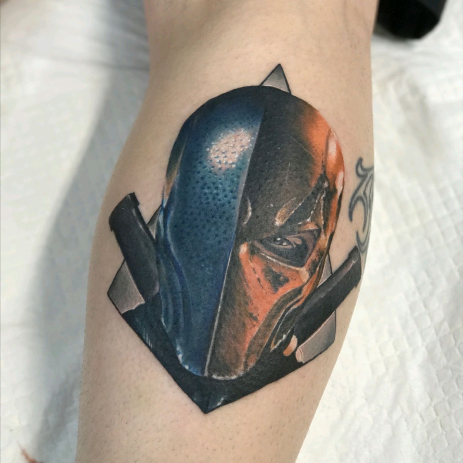 Deathstroke portrait done by Mikey Lo at Boundless Tattoo Company. First and only piece on my DC leg sleeve right now. Still finishing up my Marvel leg.