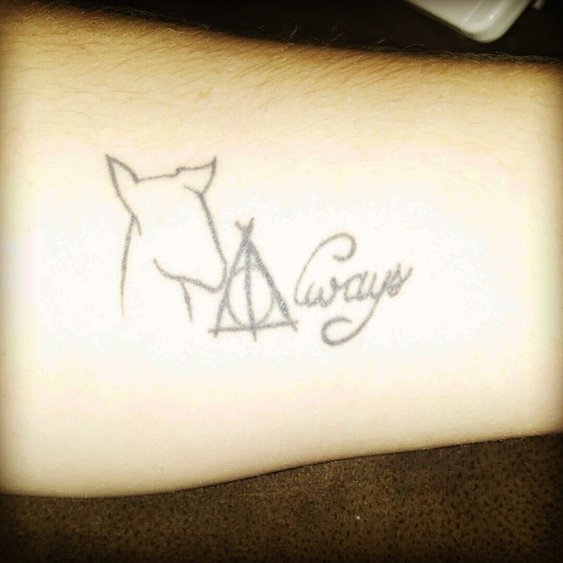 This tattoo was made the day Alan Rickman passed. He was a true inspiration to me, especially in his role as Severus Snape. This shows the feelings I have for my husband, because I have always loved, and will always love him as Severus loved Lily Evans to his dying breath. It also represents feelings I have for Severus Snape. It is a personal connection to him, even though he is fictional. Severus Snape will continue to live in my heart, just as my husband does.