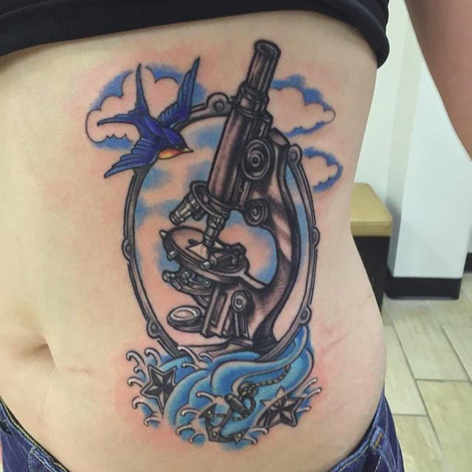 Microscope tattoo by Matthew Wojciechowski (via IG -- tattoosbymatthew) #MatthewWojciechowski #microscope #science #microscopetattoo