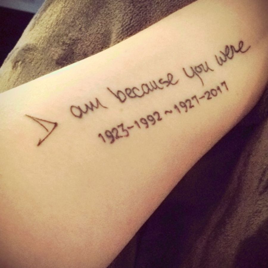 My mom passed away on August 7, 2017. I got this tattoo in my own handwriting to remember mom and dad. (Dad born 1923, passed 1992; Mom born 1927, passed 2017) #handwriting #memorialtattoo