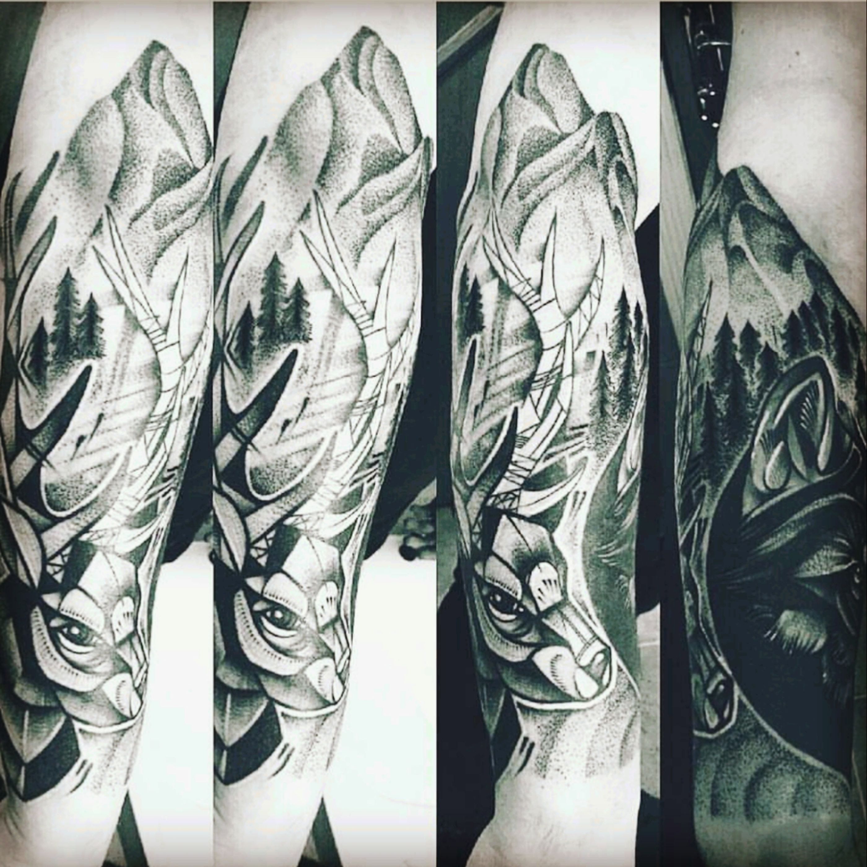 Mountain Scape background. Done at Tooth and Tiger tattoo collective, Wakefield West Yorkshire, England