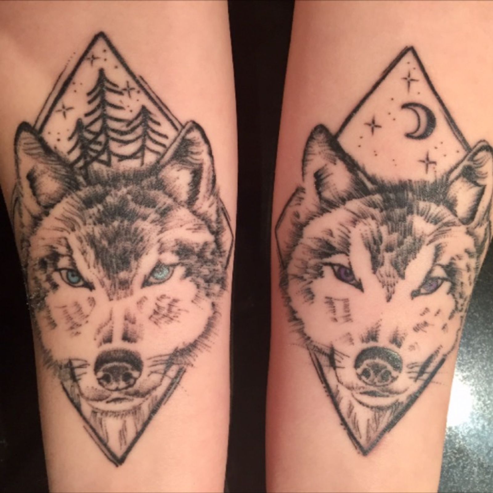 Wolves to resemble my brother and I, he is the left (day wolf) and i am the right (night wolf) together we are like a family pack, but apart we still roam like lone wolves and we'll always find each other. He is the sun, i am the moon, he is calm and steady and i am fierce and deadly. #wolves #pair #geometric #meaningful