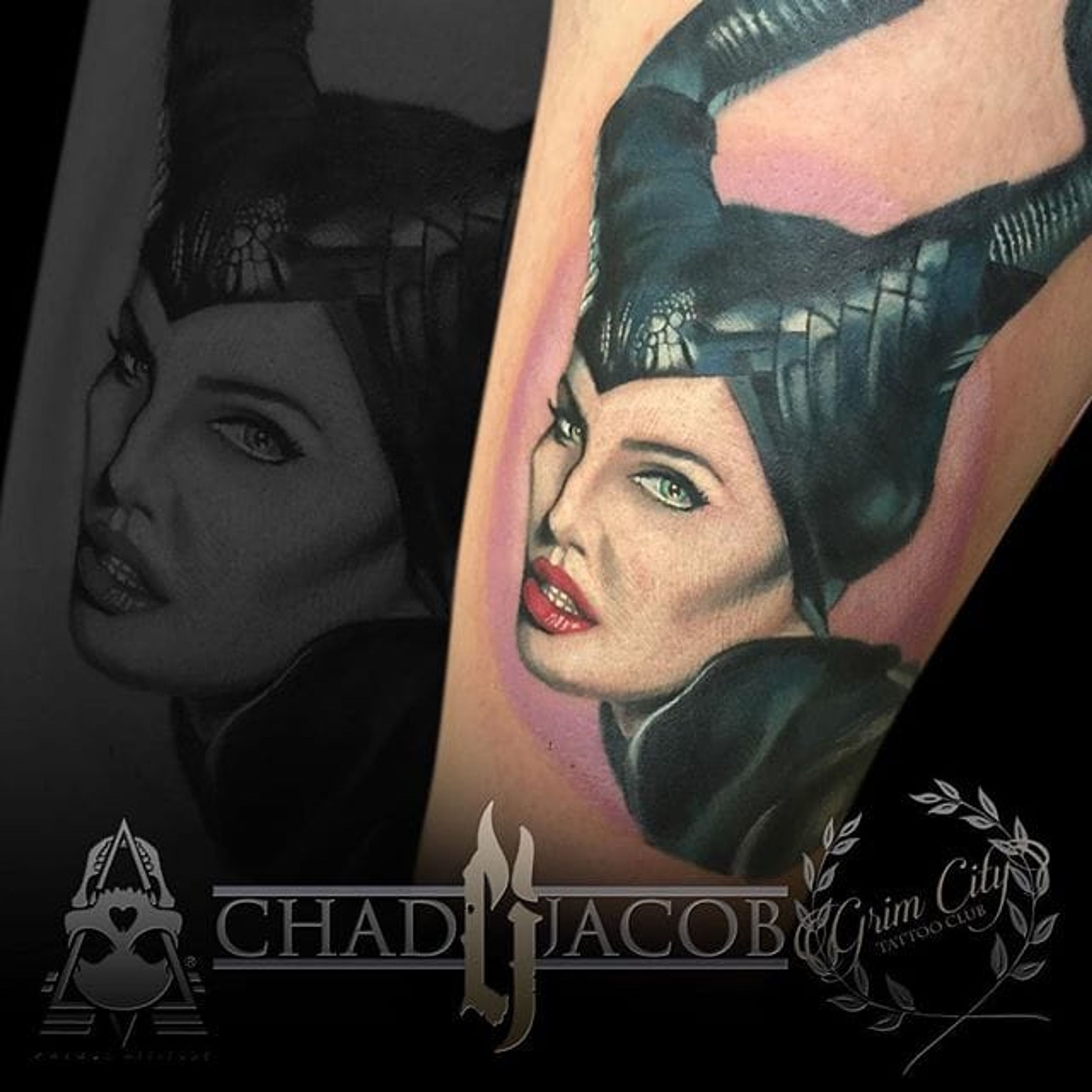 Maleficent Tattoo by Chad Jacob #Maleficent #Portrait #ColorPortrait #PortraitTattoos #ColorRealism #ChadJacob #Maleficent