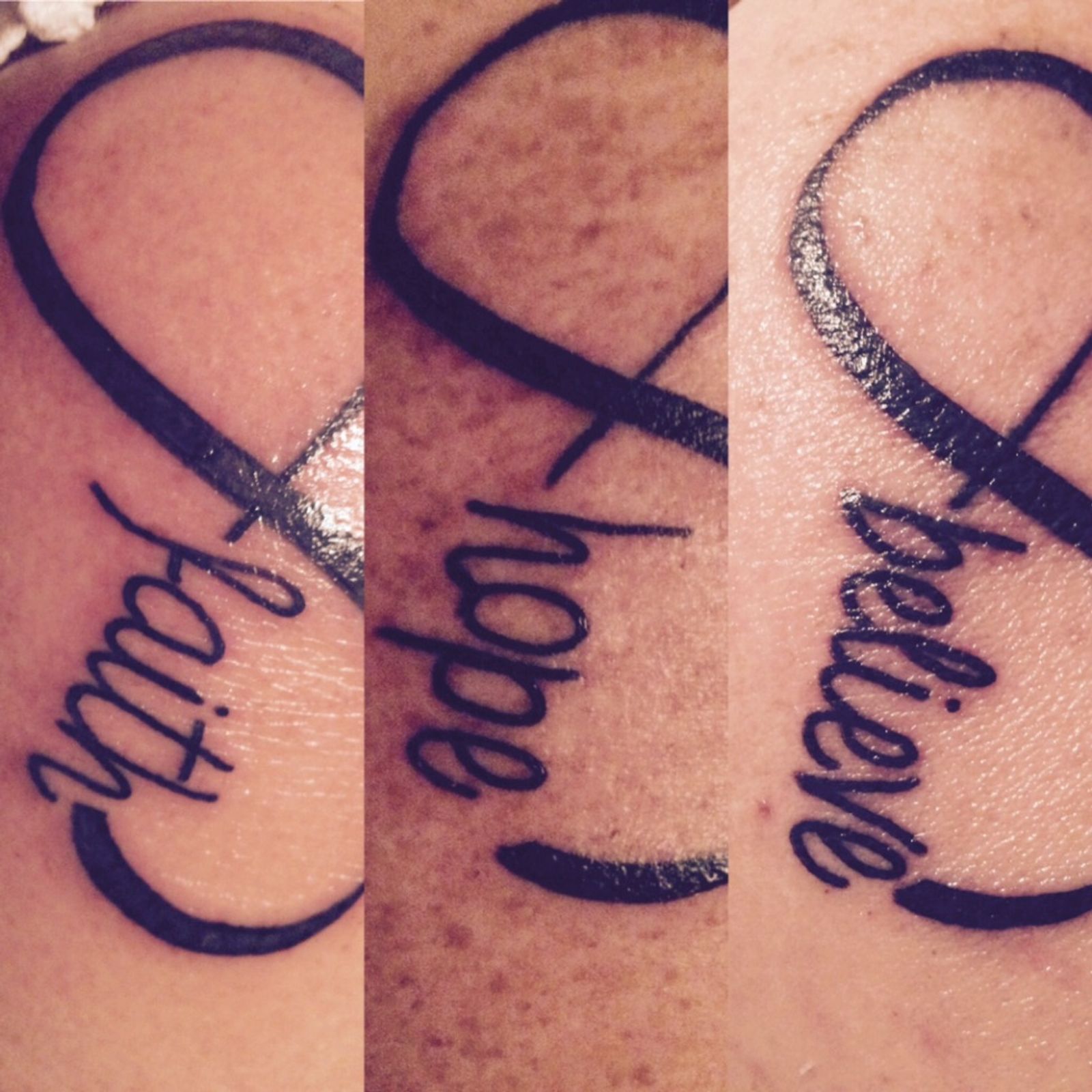 Myself and 2 daughters went together and had these tattoos done. They are infinity with each of our keywords. Mine is believe. We also are adding one symbol from each of us to the tattoo. We have added ladybugs from my younger daughter, it is her totem. I am adding a fairy. My oldest daughter hasnt decided yet. I need to add pic of tatto with updated ladybugs. My first tatto at 60yrs old!