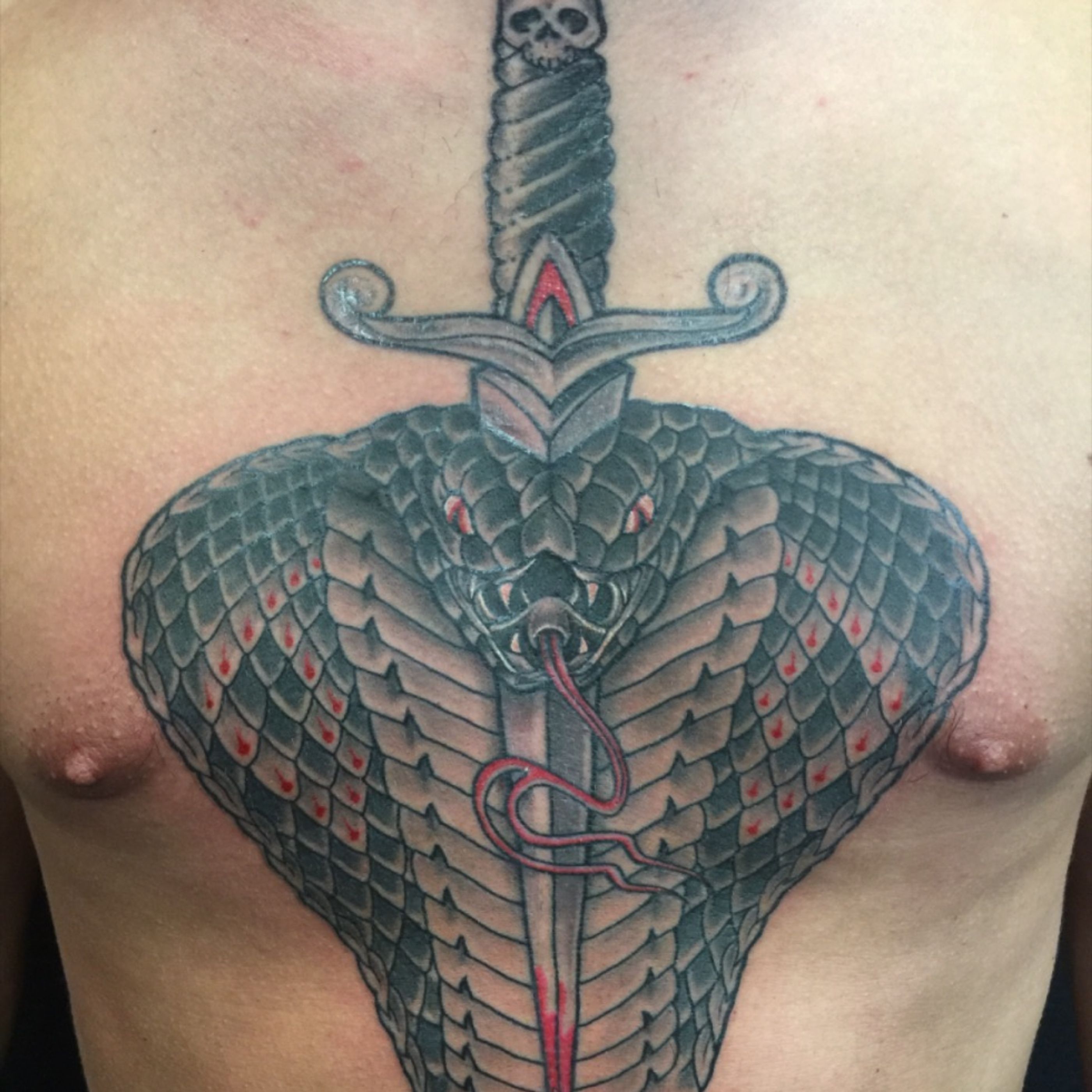 His #firsttattoo by ANDREANA VERONA @andreanaverona • Thank you Dennis! #nottoobad #supernovatattoo #astoriaqueens #astoriatattoo #astoriany #queenstattoo #astoriafinest #chesttattoo #snake #cobratattoo #newyorkcity #nyc #blood #pain #blackandgreytattoo #blackandgreycobra