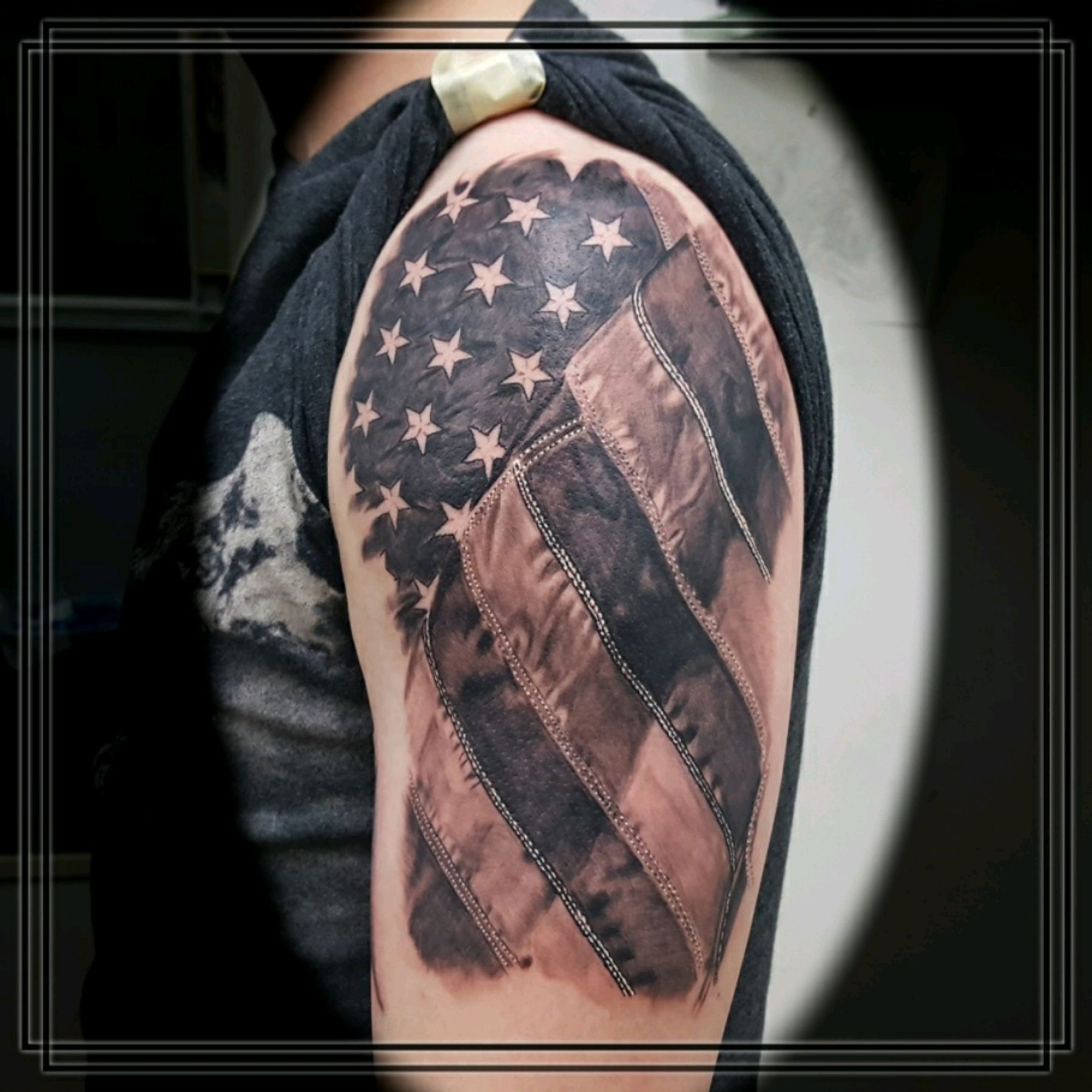 American flag piece #tenjei #cultstatustattoo #tattoooftheday #realism #blackandgraytattoo #americanflagtattoo #blackandgrey #flag