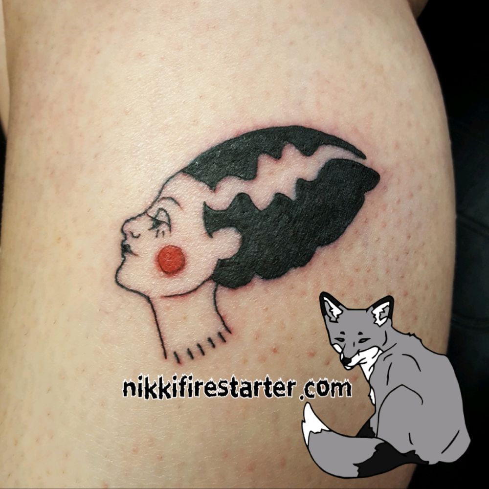 Bride of Frankenstein tattoo from our Friday the 13th special. Original design by Emma! http://nikkifirestarter.com #halloween #fridaythe13th #tattoos #frankenstein #brideoffrankenstein #horrortattoos #graphictattoos #blackink #redink #blackandred #colorink #linework #solidblack #apprentice #apprenticeartist #apprenticetattoos #calftattoo #spooky #halloweentattoos #horrormovies