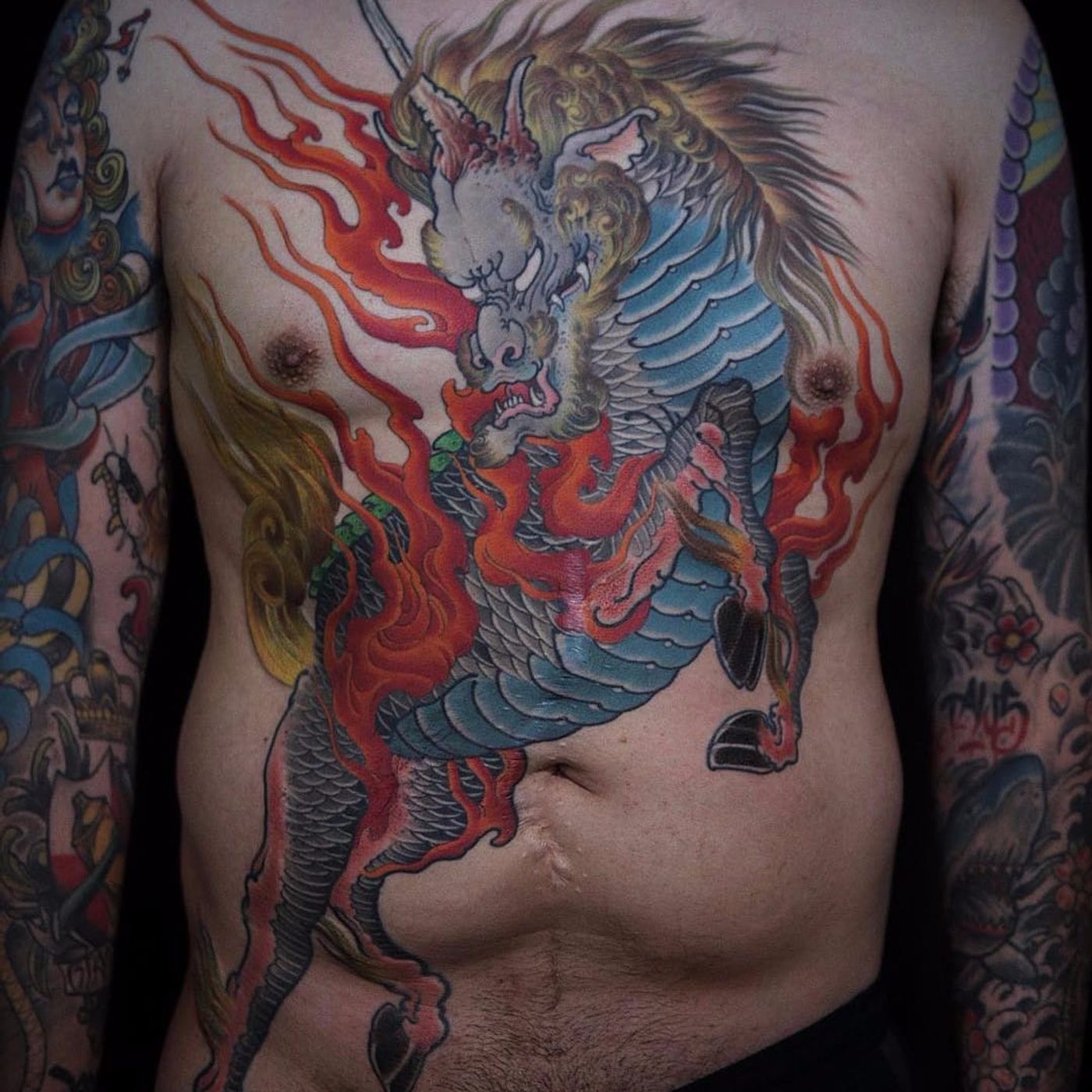 Japanese unicorn by Bill Canales #BillCanales #kirin #qilin #unicorn #Japanese #fire #scales #mythology #folklore #fairytales #cherryblossom #waves #flowers #tattoooftheday
