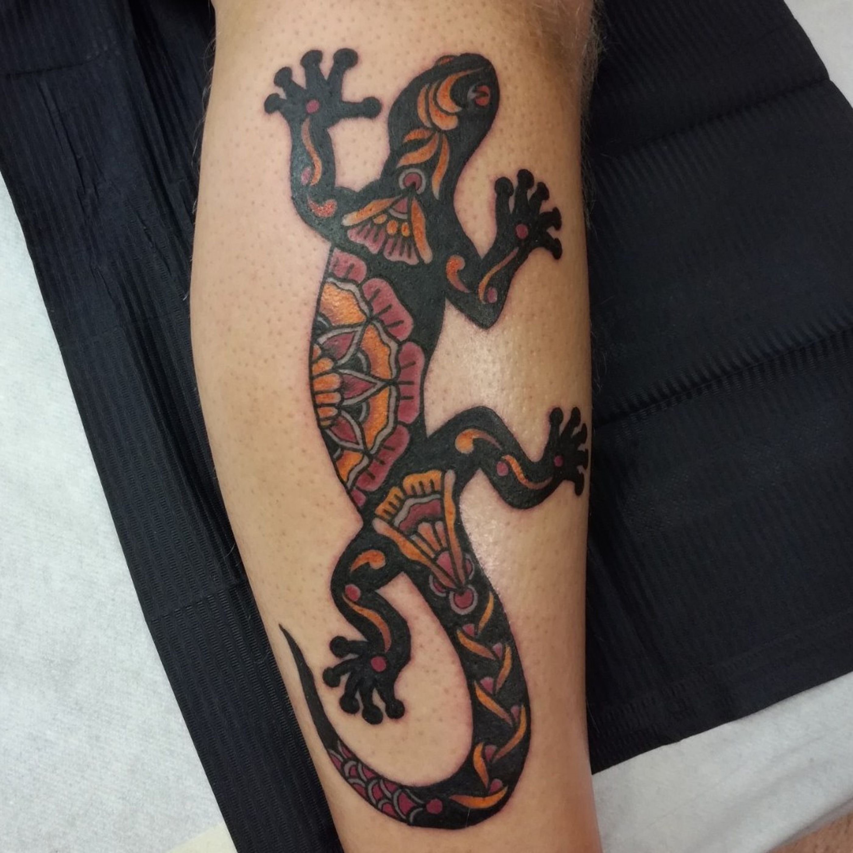 #traditionaltattoo #color #ornamental #gekko #flowertattoo #tattoooftheday