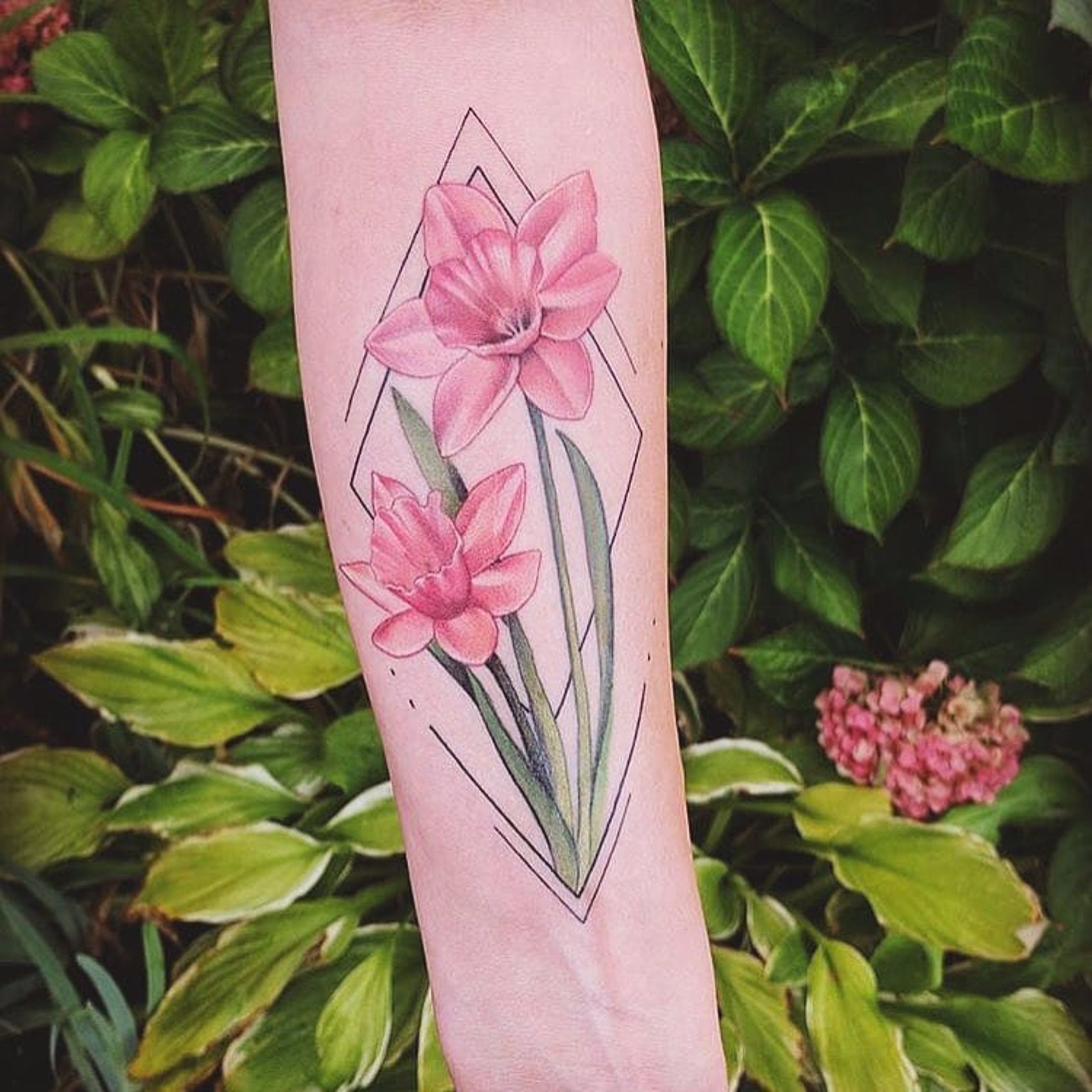 Pink daffodil by Joice Wang #JoiceWang #realism #realistic #linework #geometric #hyperrealism #color #daffodil #flowers #nature #tattoooftheday