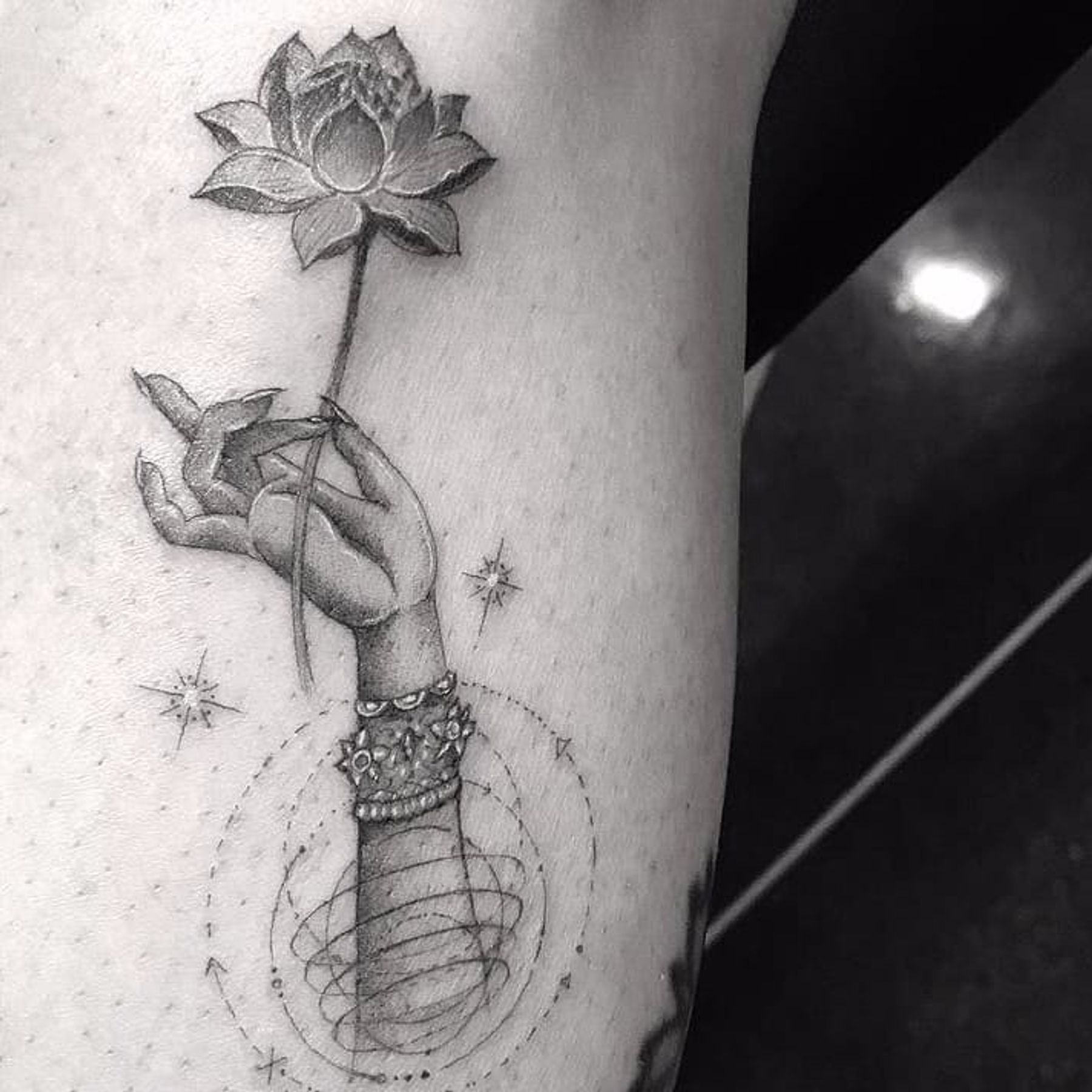 Tiny hand holding a tiny lotus by Doctor Woo #DoctorWoo #blackandgrey #linework #small #dotwork #minimal #lotus #mudra #jewelry #stars #Buddhism #enlightenment #geometric #tattoooftheday