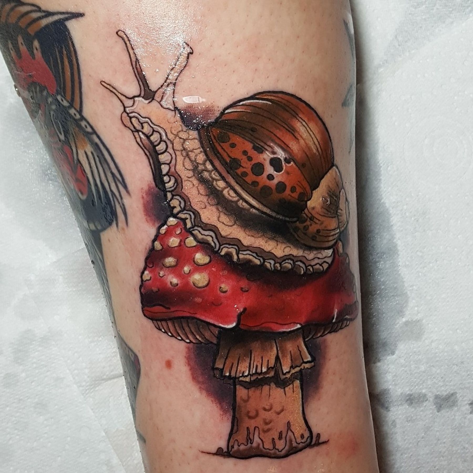 Neo-traditional snail and mushroom. #neotraditional #neotraditionaltattoo #snailtattoo #mushroomtattoo #naturetattoo