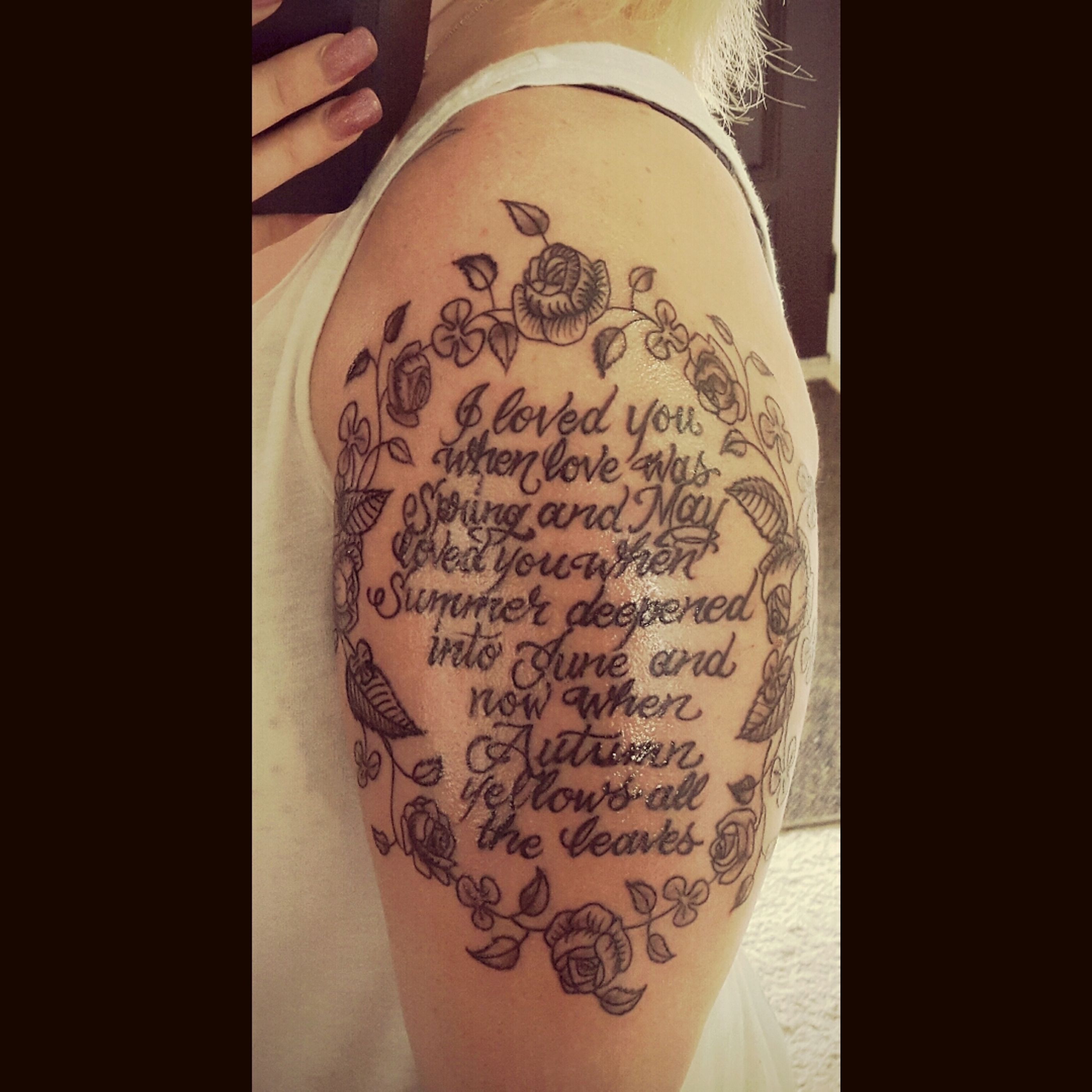 This is my latest tattoo. I sat for 8 hours. This picture was taken a few hours after. My arm was stingy and swollen. But, I am so happy with it. The quote is one of my favorites ever. My artist is Alex Cartwright.