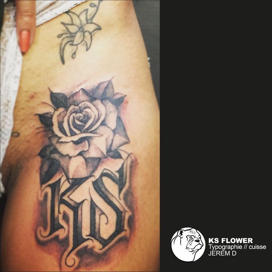 Rose et lettrage réalisé par l'artiste JeremD en noir et valeur de gris au sein de l'entreprise 95ink.