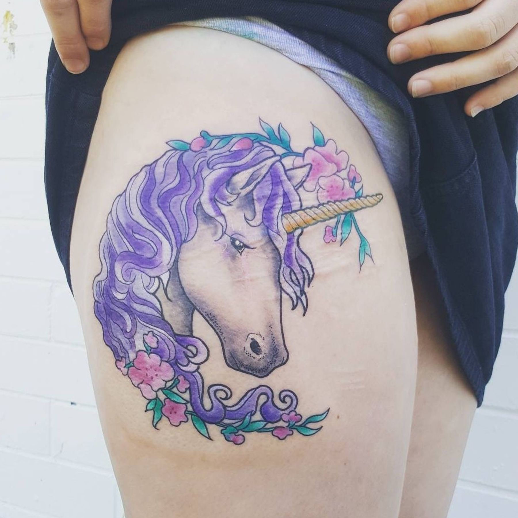 Magical unicorn tattoo. #unicorntattoo #fantasytattoo #whimsical #watercolortattoos #pastelcolor #ladytattooers